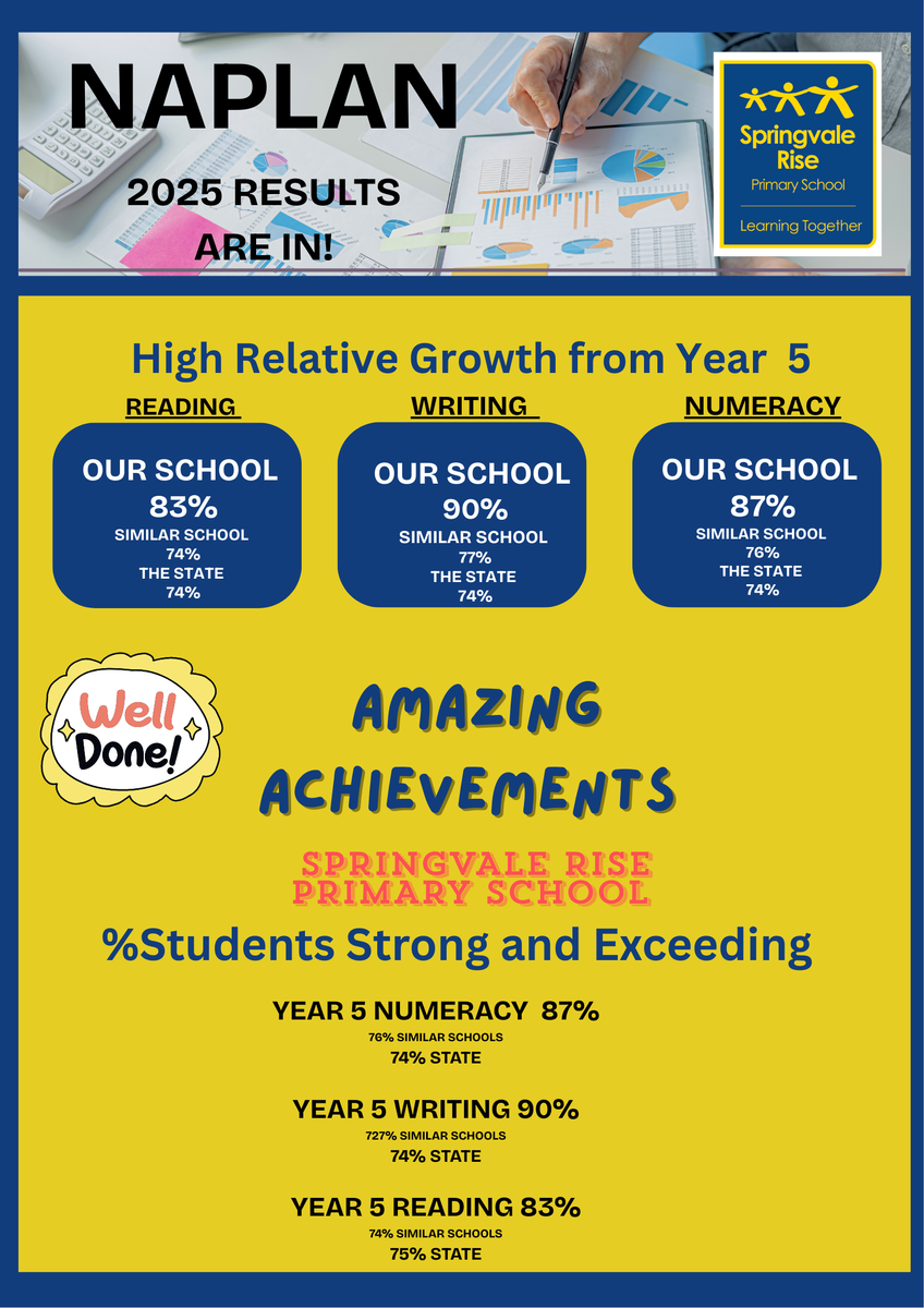 NAPLAN - I would also like to take this opportunity to celebrate our outstanding 2025 NAPLAN results. Congratulations to our Year 5 students for the incredible growth they have shown since Year 3—with significantly more of our students demonstrating high growth compared to students in similar schools and to Year 5 students across the state. Bravo to you all—we are very proud! Even more impressively, this same cohort has outperformed students in both similar schools and across the state in Numeracy, Writing, and Reading. An outstanding achievement and a credit to the hard work of our students, staff, and families.
