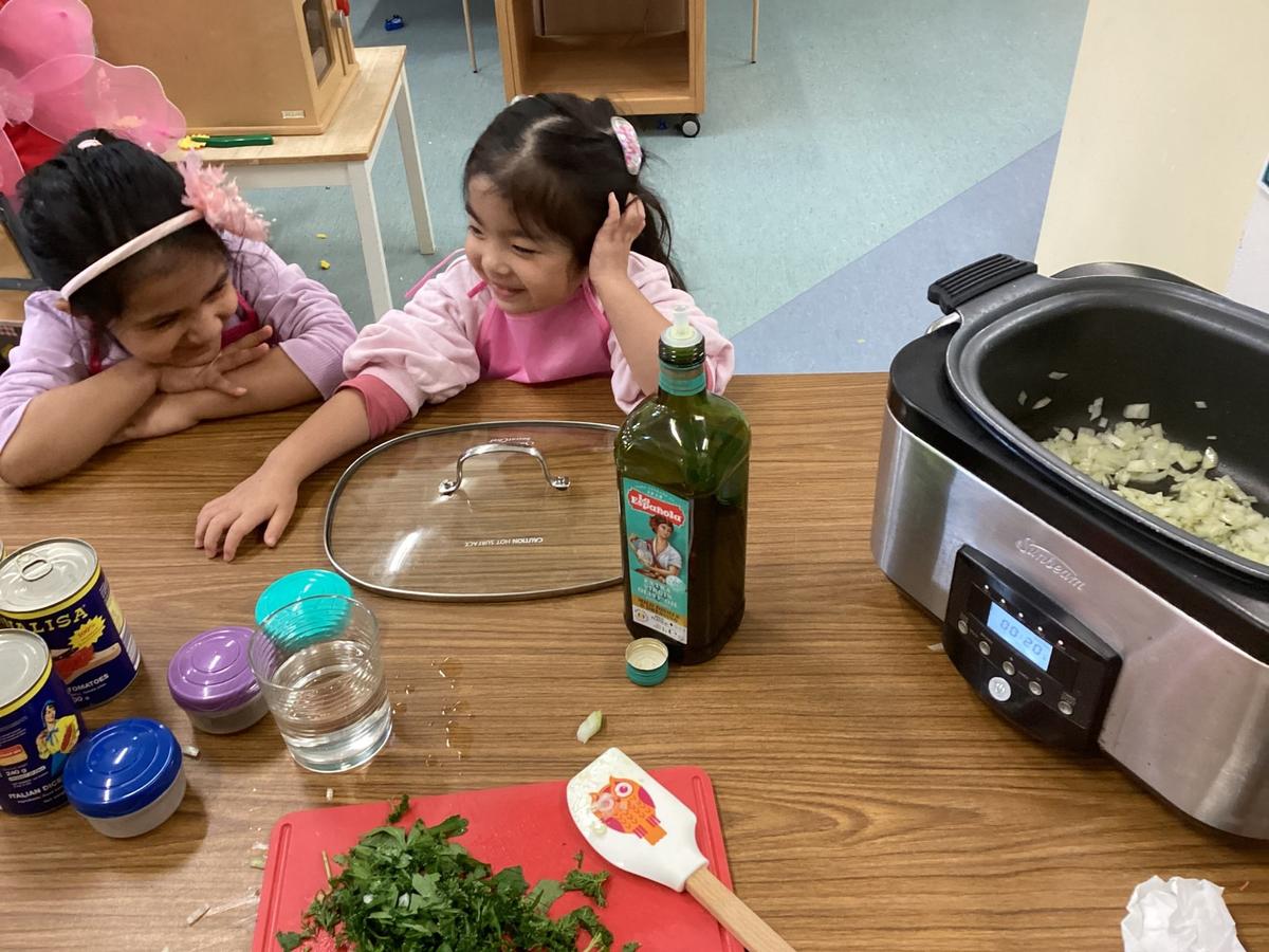 Last week, we explored cooking as a group by making pasta sauce together. The children's ongoing interest in dinosaurs inspired us to thread dinosaur-shaped pasta, which led into our idea to make dinosaur pasta with sauce. Sharon brought her slow cooker into kinder, and we started by chopping up onion, garlic, and parsley. With four cans of diced tomatoes ready, the children helped stir the sauce as we added salt, black and white pepper, and fresh parsley picked Amanda’s parents' garden. Some children chose to taste the parsley and shared that they enjoyed the flavour. Throughout the morning, we kept returning to the slow cooker to check on our sauce. The children were keen to watch it progress and enjoyed taking turns to give it a stir.