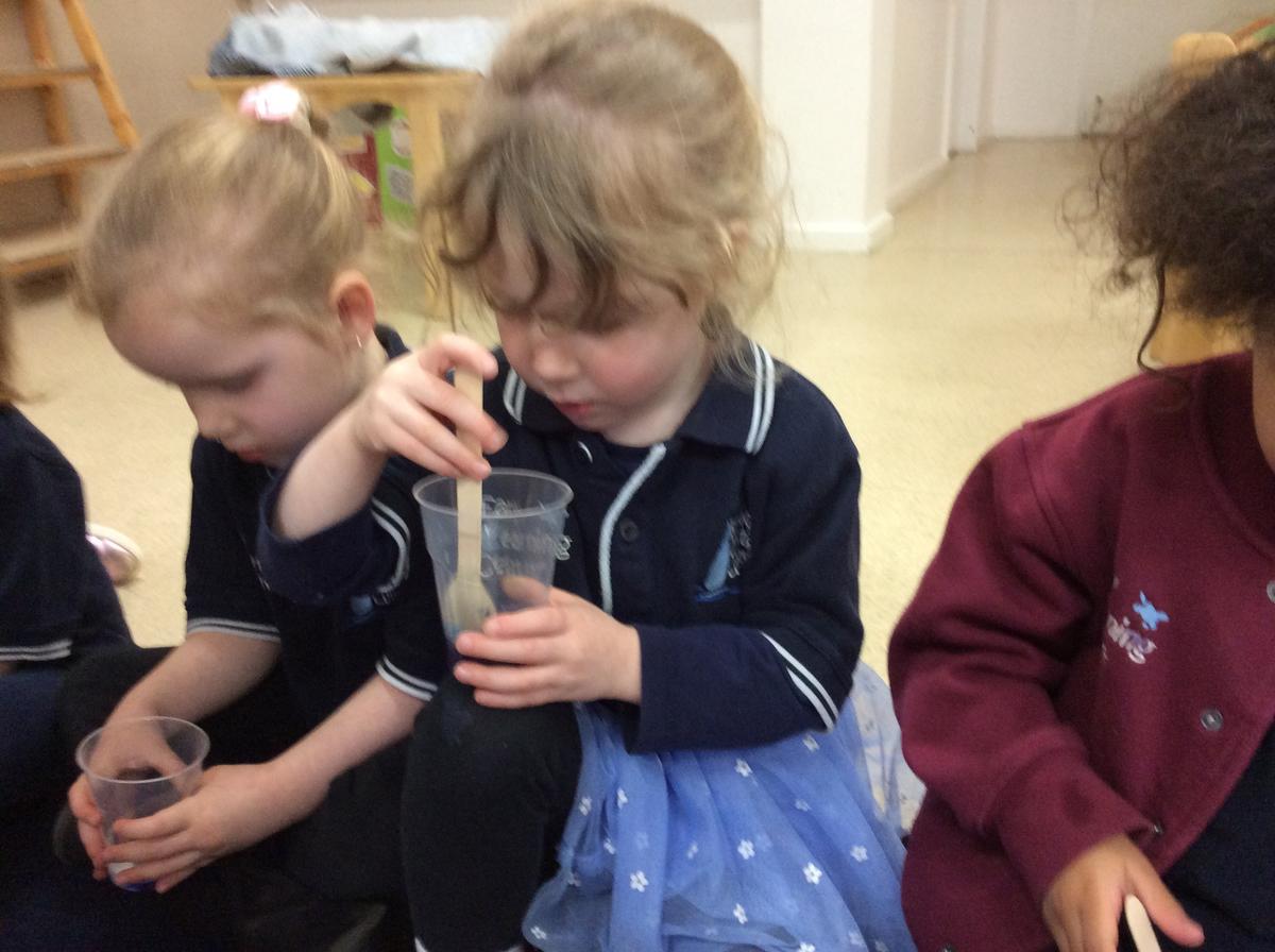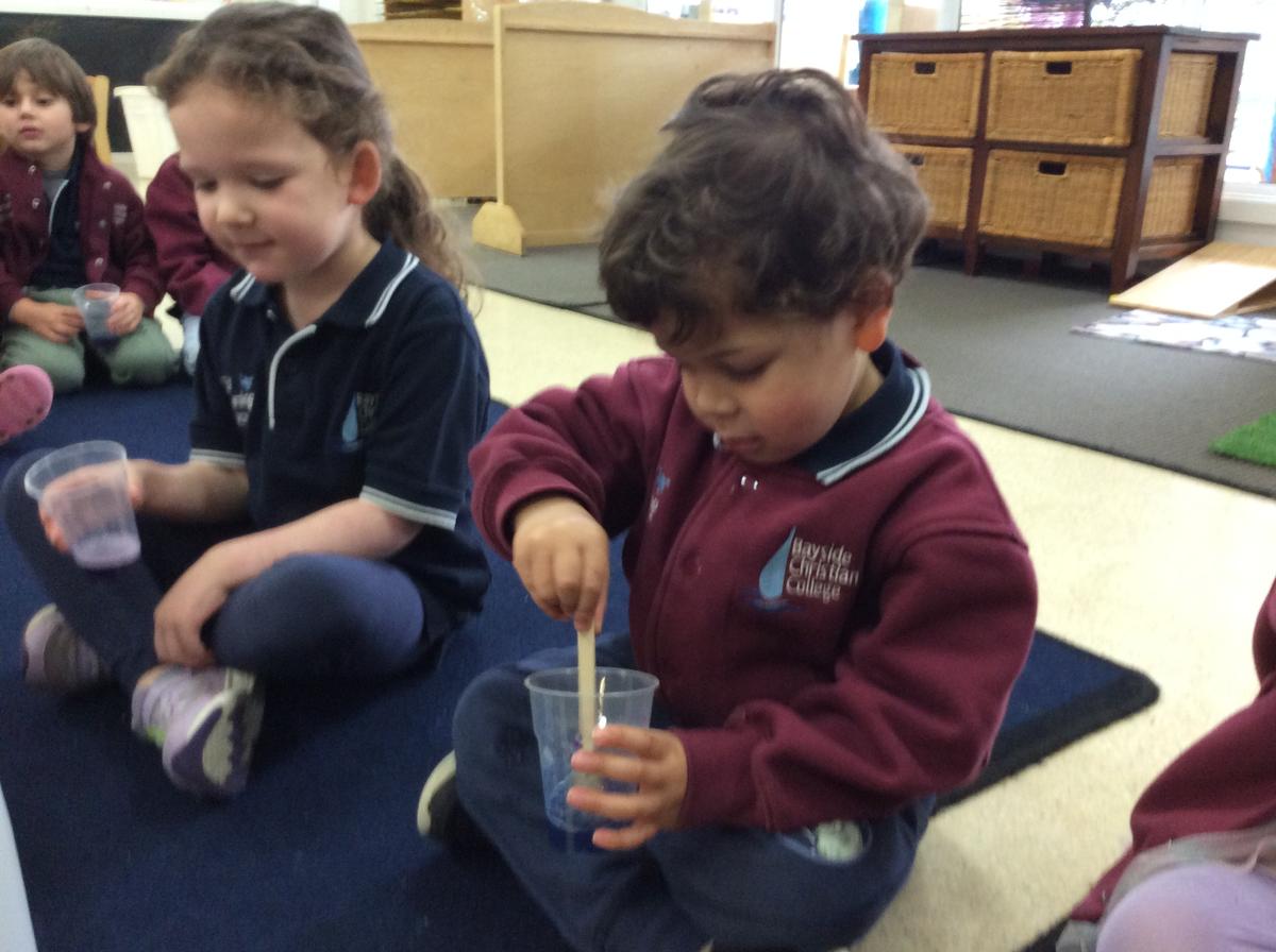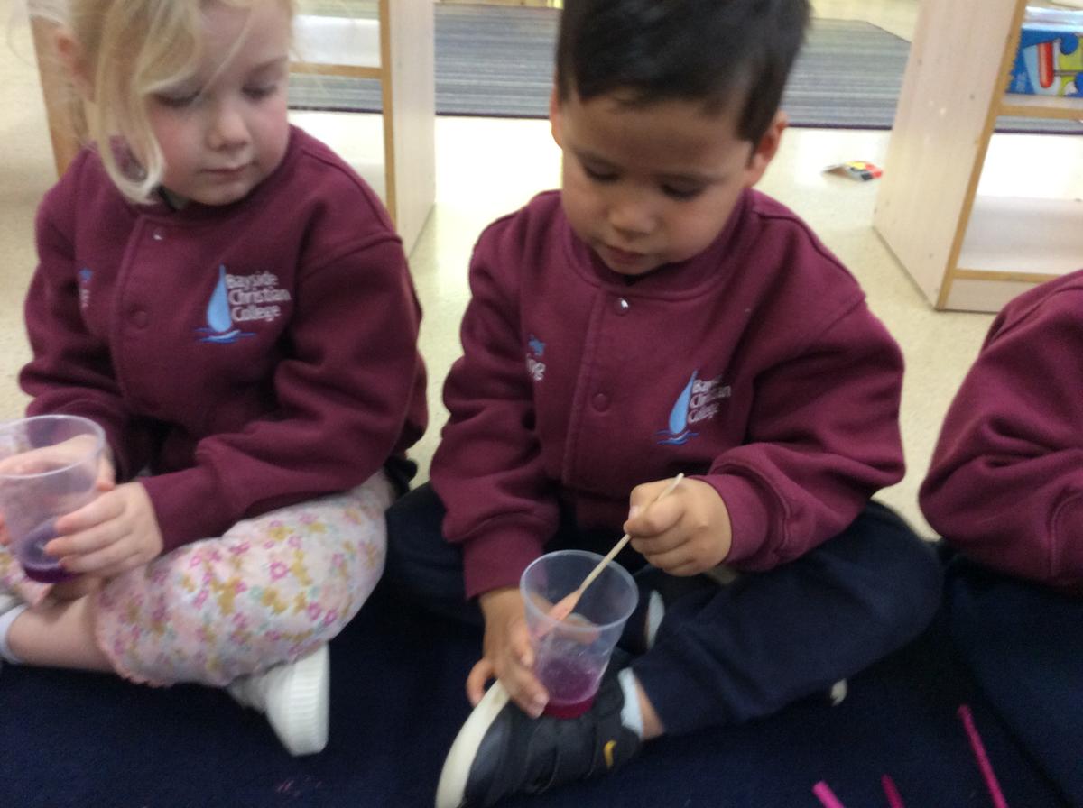 ELC 3 conducted a science experiment, using red cabbage as an indicator. The children noticed that although it is called red cabbage, it is actually purple in colour. First, we mixed the cabbage with warm water in the blender, creating a purple liquid. Each child held a cup with some of the liquid inside, and chose whether they would like to add vinegar or bicarbonate of soda. The children took turns predicting what they thought would happen, then mixed the ingredients together. Those with vinegar (an acid) noticed that the liquid turned pink. Those with bicarbonate of soda (a base) watched the liquid turn blue.
