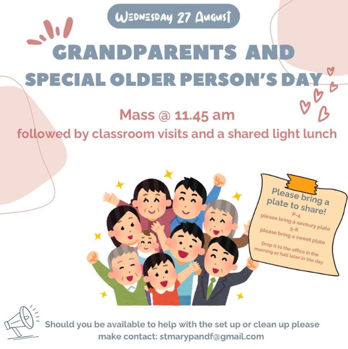 The P&F are excited to be preparing for our upcoming Grandparents’ Day Celebration on Wednesday August 27!