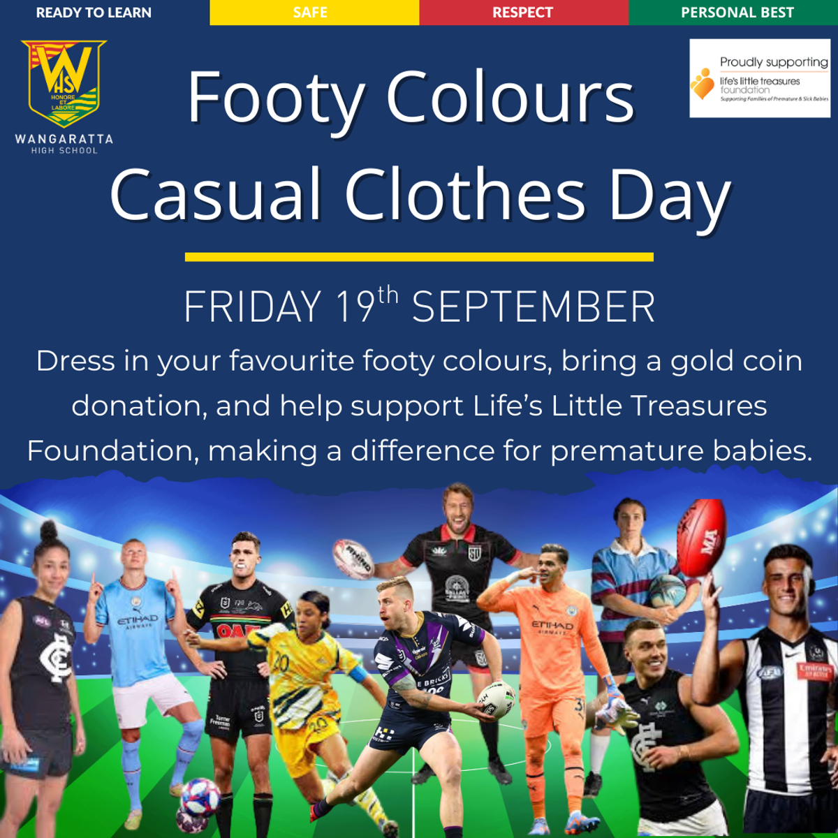 🏉⚽Come dressed in your favourite footy colours, bring a gold coin donation, and support Life’s Little Treasures Foundation, helping premature babies and their families.