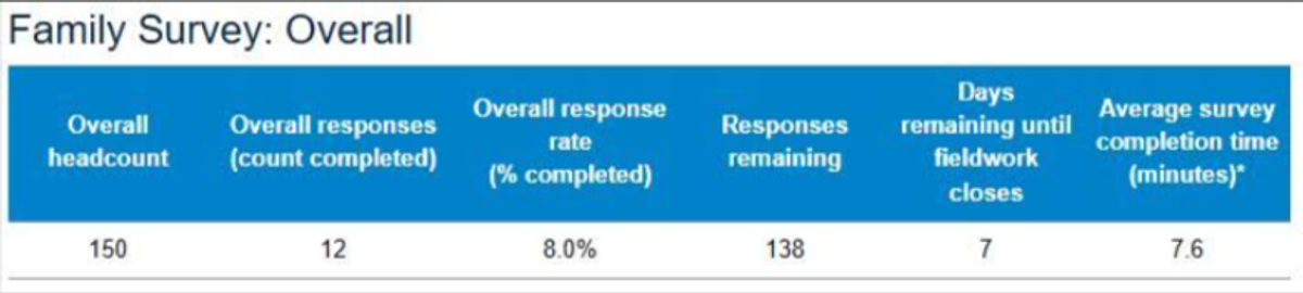 So far, 12 families have completed the survey. The average survey completion time is 7.6 minutes. So, we would encourage as many families as possible to undertake the survey prior to next Friday, 19 September.