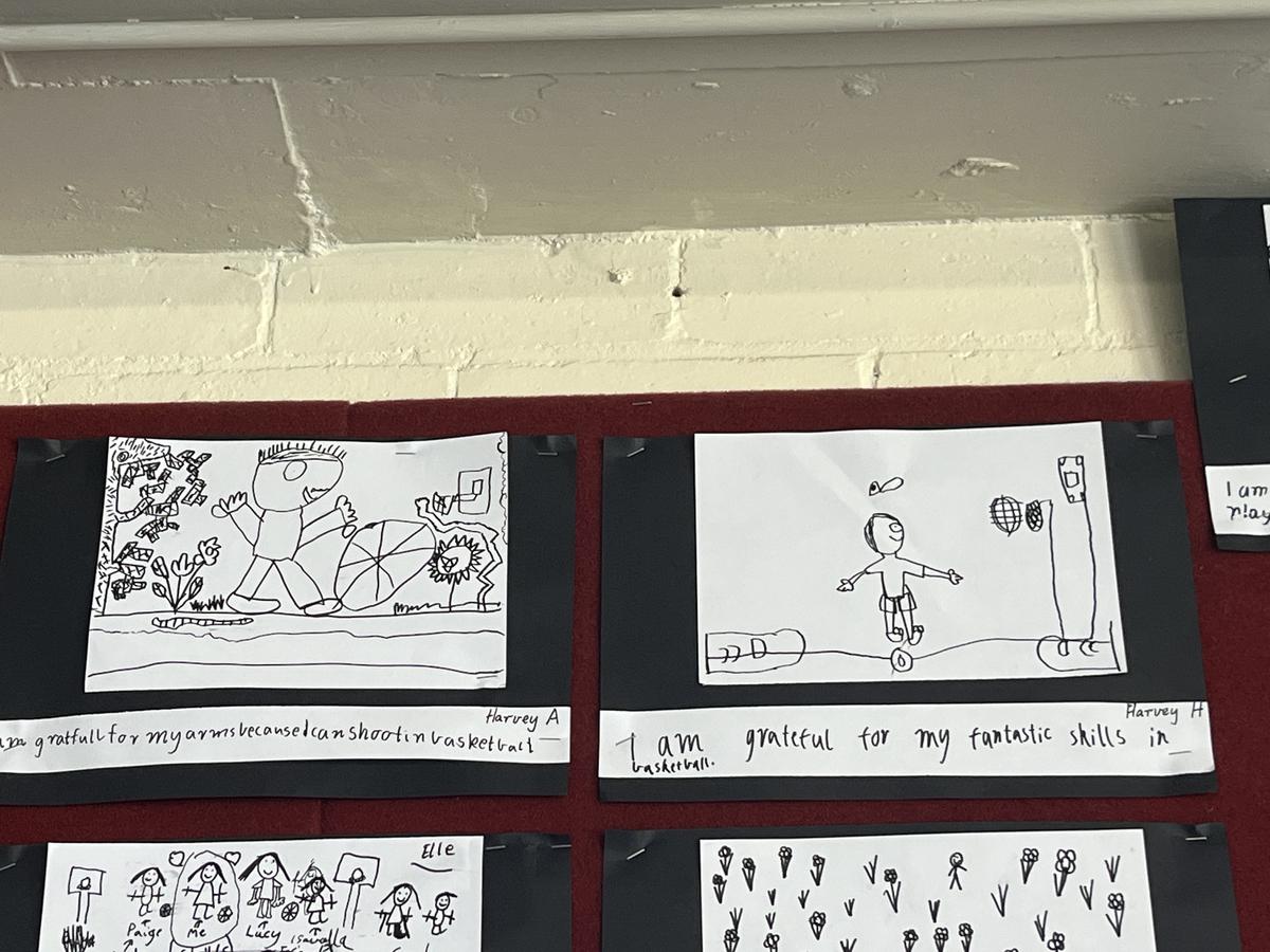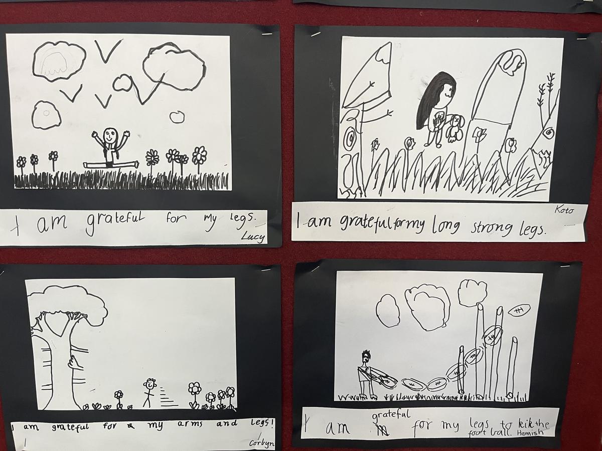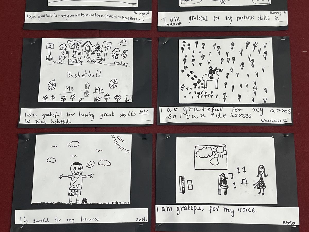 This term, our focus on gratitude has invited us to pause and reflect more deeply on the importance of appreciation—not only for the people and blessings around us, but also for ourselves. We have been learning that our bodies are precious gifts from God, created with care and purpose. By taking the time to recognise and value the uniqueness of who we are, we grow in both thankfulness and respect for the life we have been given. This gentle reminder encourages us to nurture a positive outlook and to care for ourselves in ways that honour the wonderful gift of life God has entrusted to us. We used black fine liners to create a detailed yet simple picture of our bodies. We also created sentences of gratitude.