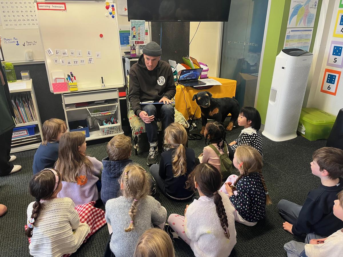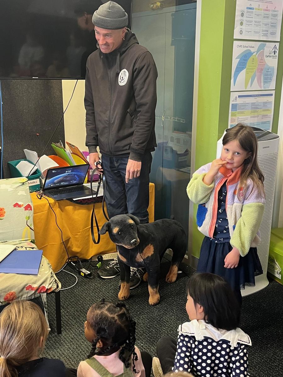 This morning the Foundation students had a visit from Mabel's dad, Tim. Tim is a dog trainer and he talked to the students about dog safety and how to look after your dog. He brought in his special dog, Pseudo to help teach us how to be safe around dogs.