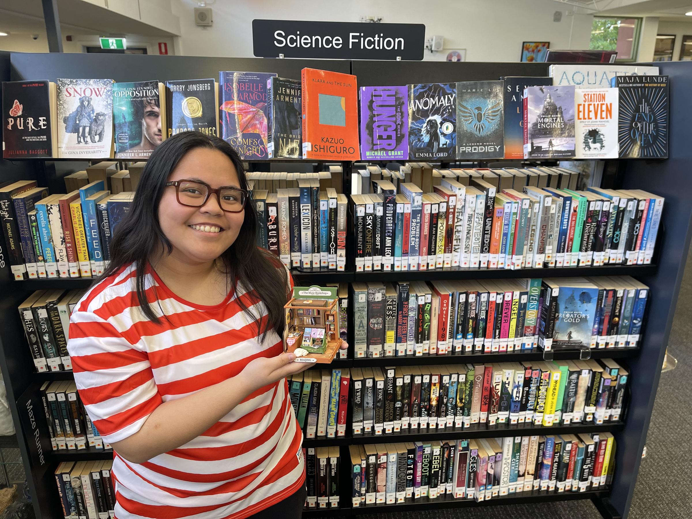 The feature photo is of Year 12 student Lara Guevara who made a bookshop diorama for the library.