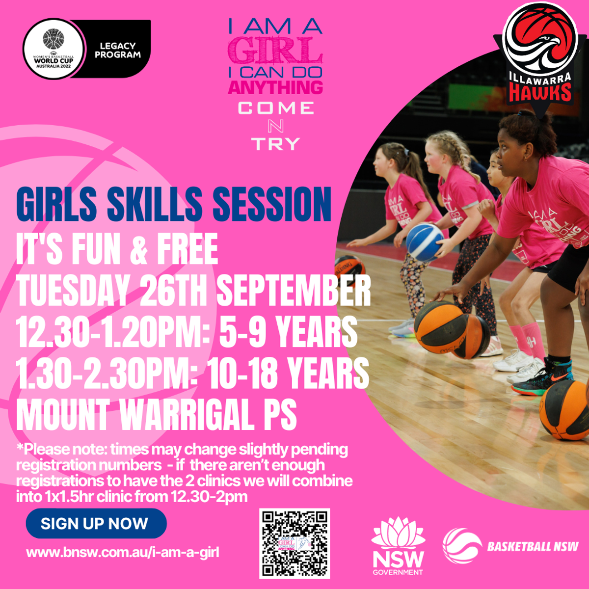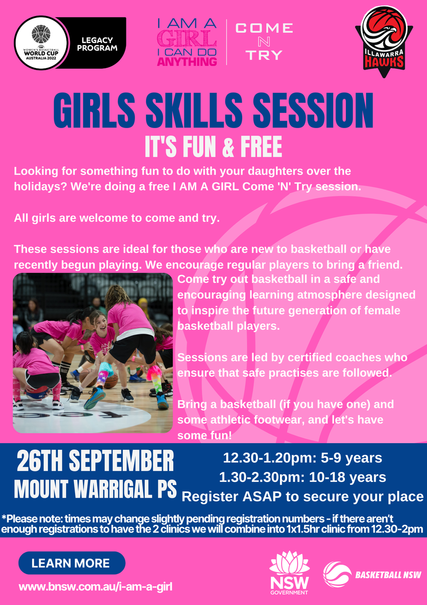 GIRLS, GIRLS, GIRLS, Basketball NSW is hosting a free girls-only session basketball clinic at Mount Warrigal Public School aimed at new or returning basketballers that want to learn some new skills, be active and have fun making new friends. Join us on Tuesday, 26 September 2023 from12.30pm - 1.20pm (5yrs - 9yrs) and 1.30pm - 2.30pm (10yrs - 18yrs). Join us and register now.