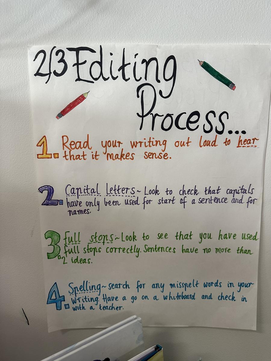 Last week, we established our official class Editing Process. Students brainstormed key skills they felt were crucial for improving their work. Their suggestions were summarised into the following four steps: