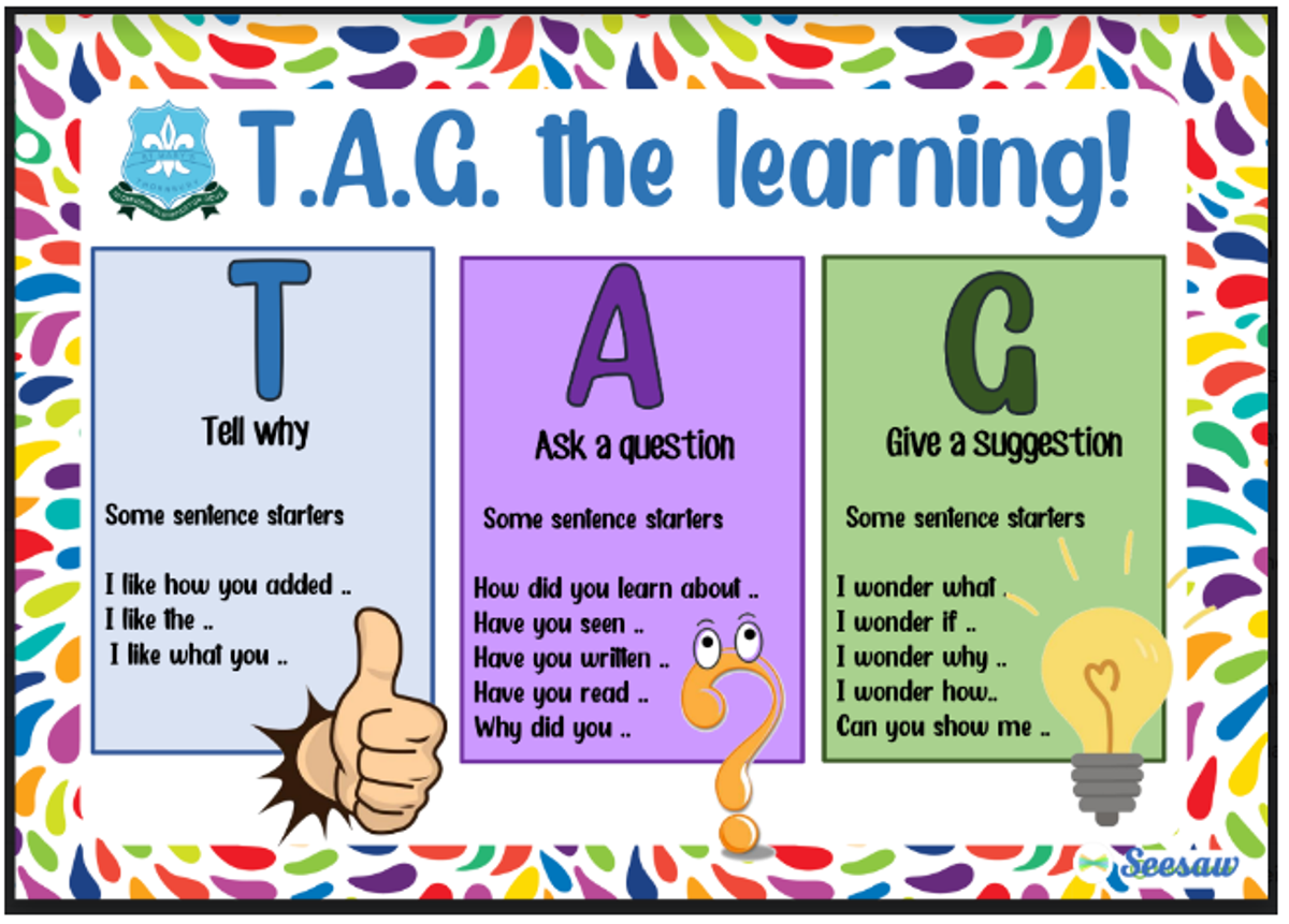 We have developed easy sentence starters under three headings that will help you respond to your child’s post for the week. (The T.A.G. poster below) All you need to do is log onto the SeeSaw platform and view the learning. These sentence starters will get the conversation going and maybe stop the ‘I didn’t do much today’ or ‘I played’ responses as they want to share their successes. Please remember that these learnings may be a work in progress and have errors clearly evident, as the students are the driver of what is being placed on their platform.