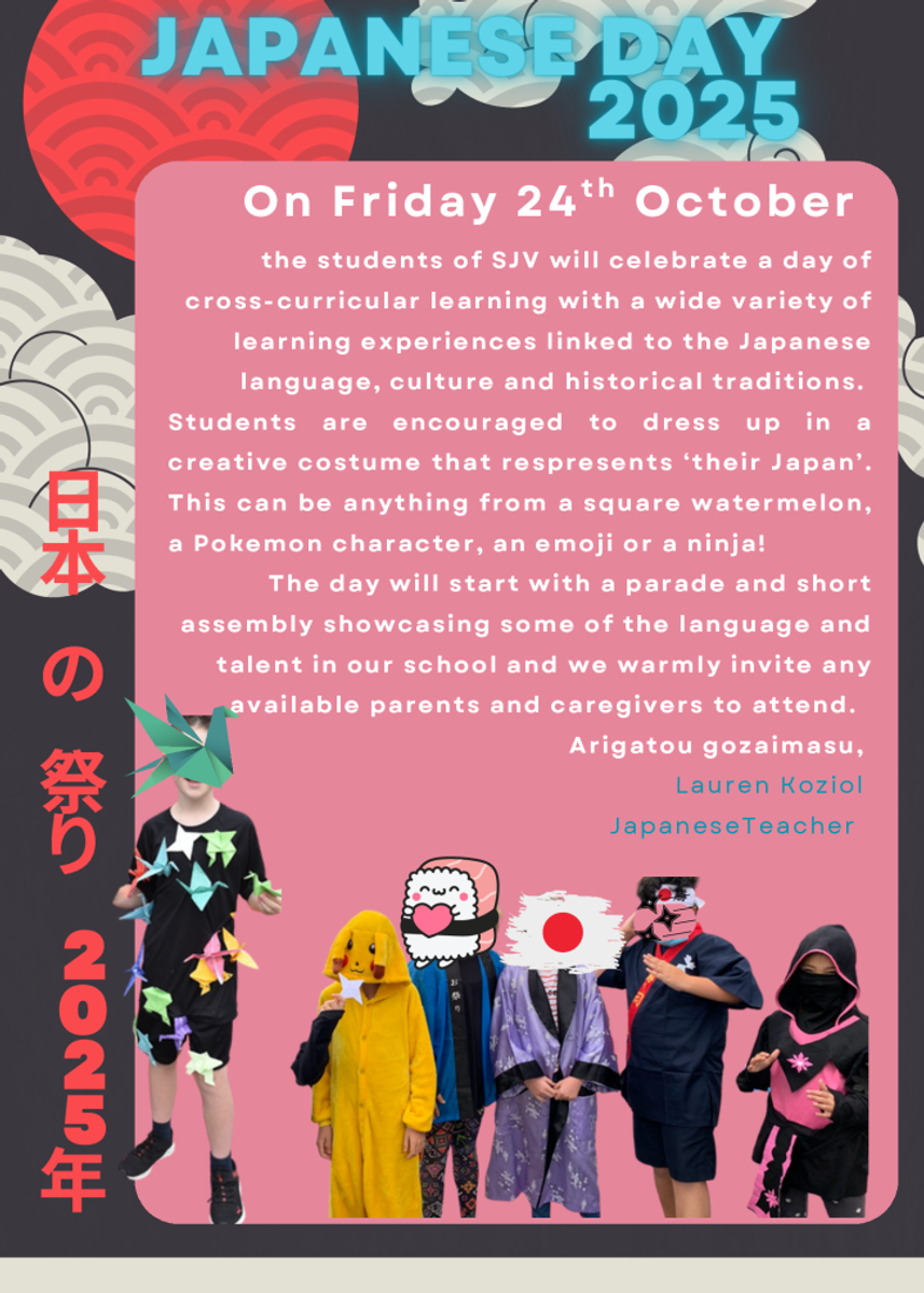 Next Wednesday the 29th of October, I will have the privilege of hosting Prep parents 2025 for an information evening. It will be a wonderful occasion to have parents old and new coming in and learning about what their child’s first year of school is all about here at SJV and the many wonderful learning opportunities that they will have. We look forward to having our Prep 2026 students visiting us for their first transition on Friday the 14th of November.
