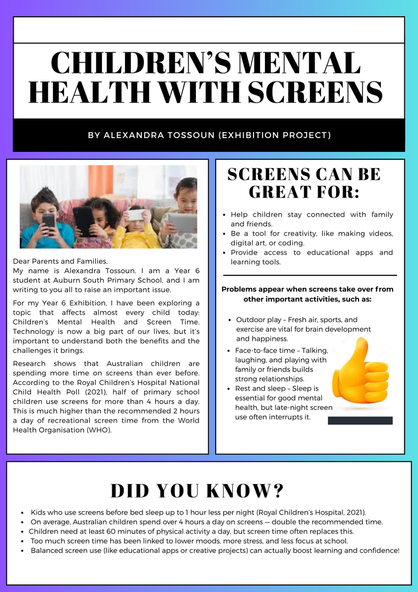 Not all groups presented presentations to teach students, one group organised a food drive so students would have to bring in non-perishable food items. Which were then donated to the Salvation army. They also wrote a letter to Coles about their exhibition and topic, in return they received a three hundred dollar voucher to Coles which they then gave away to someone in need. But one group really wanted to connect to students, through a club. They created a craft club to calm people's stress and anxiety, they asked other year six students to help teach younger students how to draw, crochet, make things out of origami and so much more.
