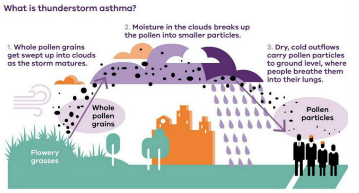 Grass pollen season, which typically runs from October to December each year in Victoria, brings an increase in asthma and hay fever symptoms. It also increases the risk of thunderstorm asthma. For people with asthma or hay fever, especially those who experience wheezing or coughing with their hay fever, thunderstorm asthma can be sudden, serious and even life threatening.