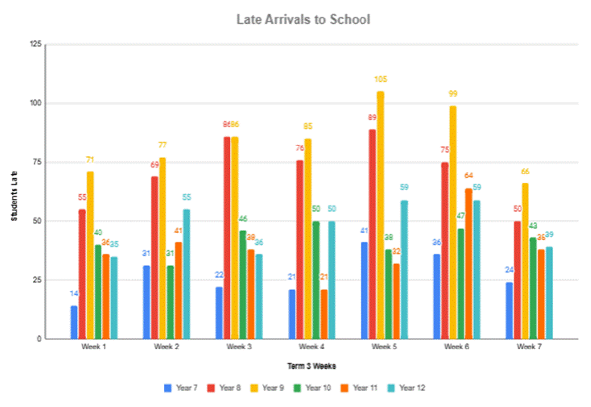 As we reflect on Term 3, we want to bring to your attention an important matter concerning student punctuality. Our recent data (see below) indicates that a number of students have been arriving late to school, especially our Year 8 & 9.