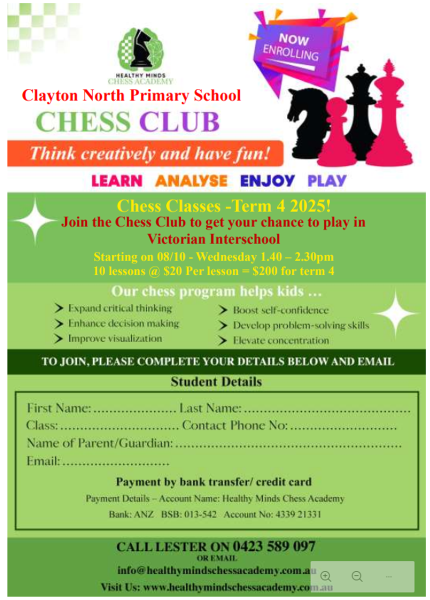 If you are interested in your child engaging in structured Chess lessons, please see the attachment below for enrolment details.