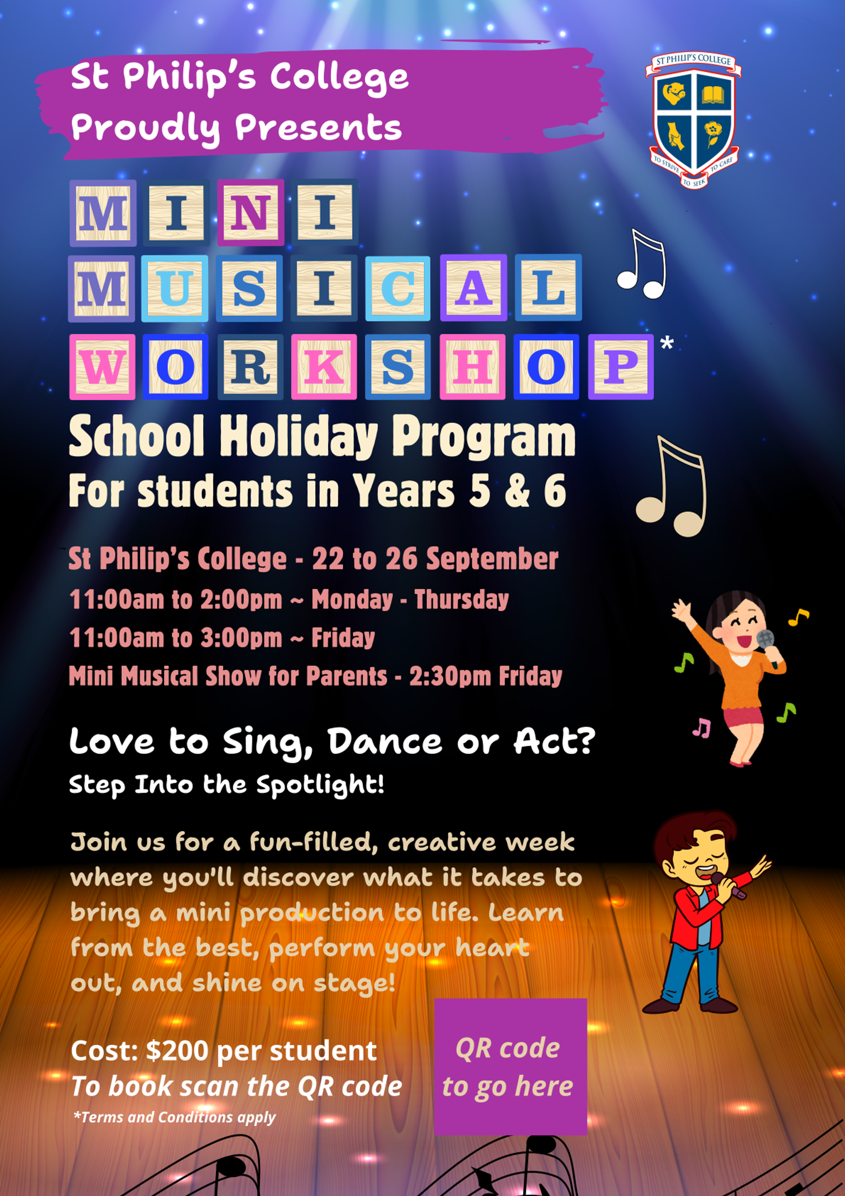 For the very first time St Philip’s College is offering a ‘mini-musical’ school holiday program from the 22nd to 26th September. Using the College’s state-of-the-art facilities, budding performers will be immersed in a fun and creative holiday experience as they learn new skills and share their talents to produce a mini-musical performance by the end of the week.