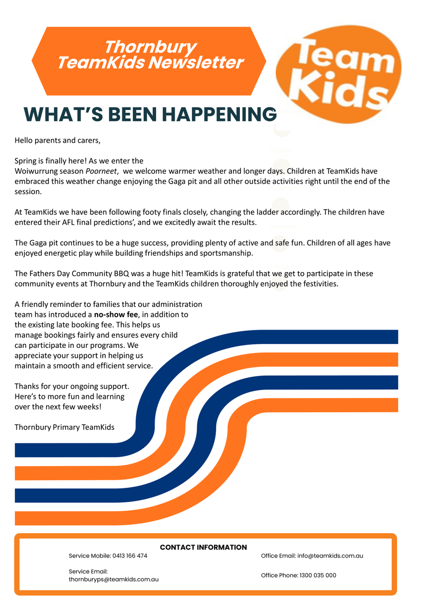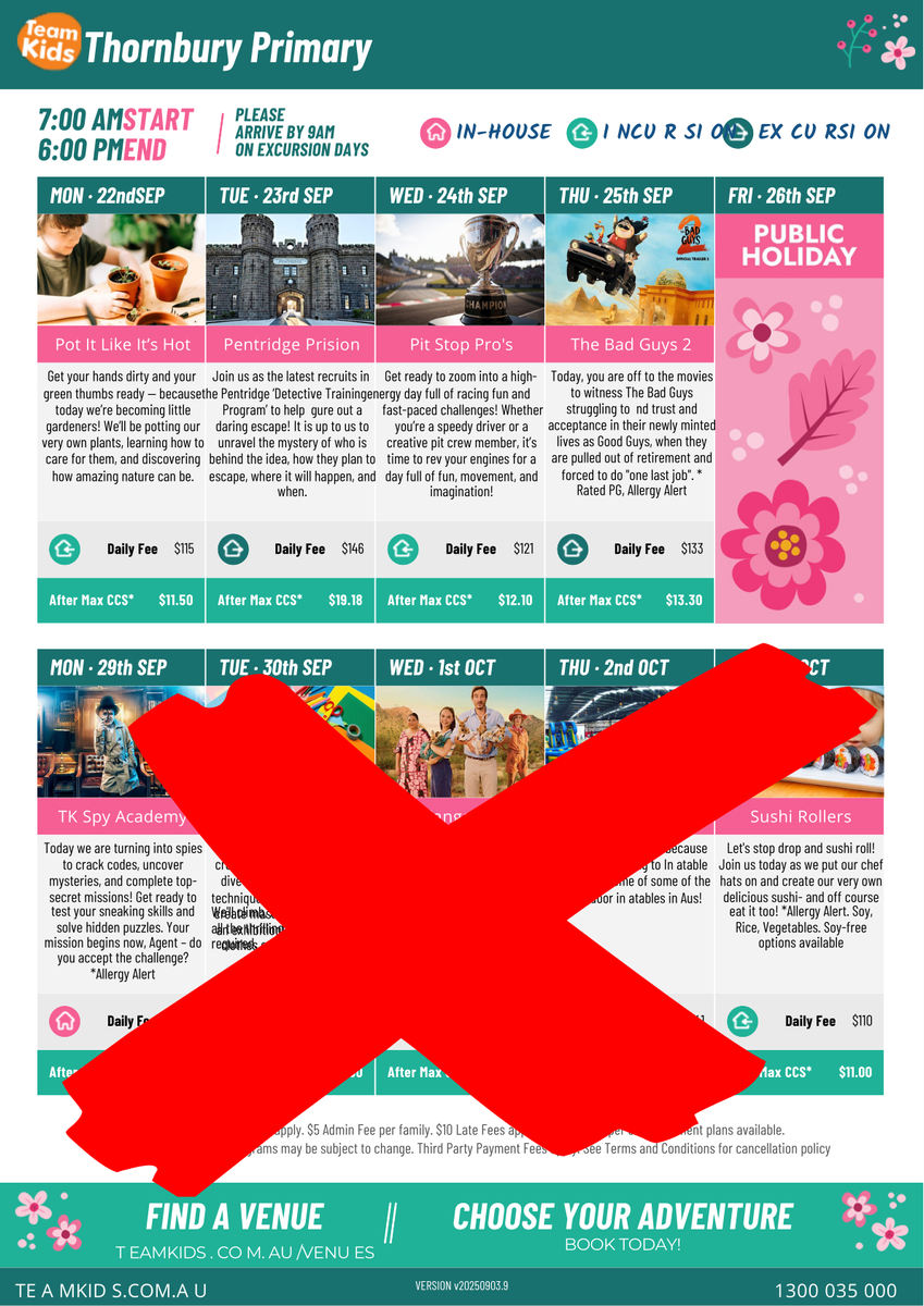 As a result and due to the nature of the work, TeamKids Thornbury will not have access onsite and will unfortunately be CLOSED for the 2nd week of Vacation Care from 29th September 2025 until 3rd October 2025.