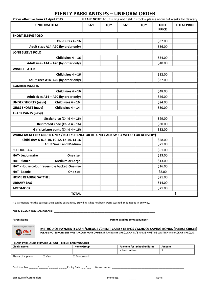 Please find below the 2025 uniform pricelist effective 22 April 2025