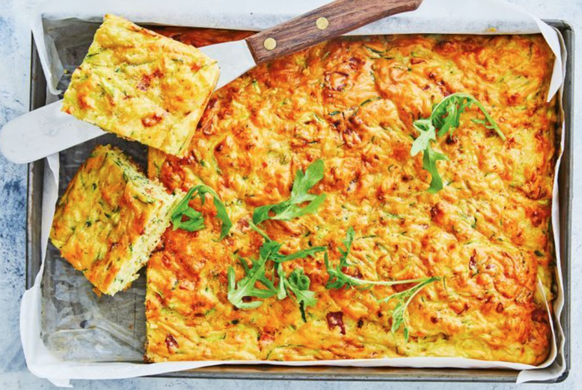 - Add the 2 (about 380g) zucchini, coarsely grated, excess moisture squeezed, 80g gluten-free cheddar, coarsely grated, bacon mixture and extra oil. Stir to combine. Pour the mixture into the prepared pan and bake for 30 minutes or slice is golden and set.