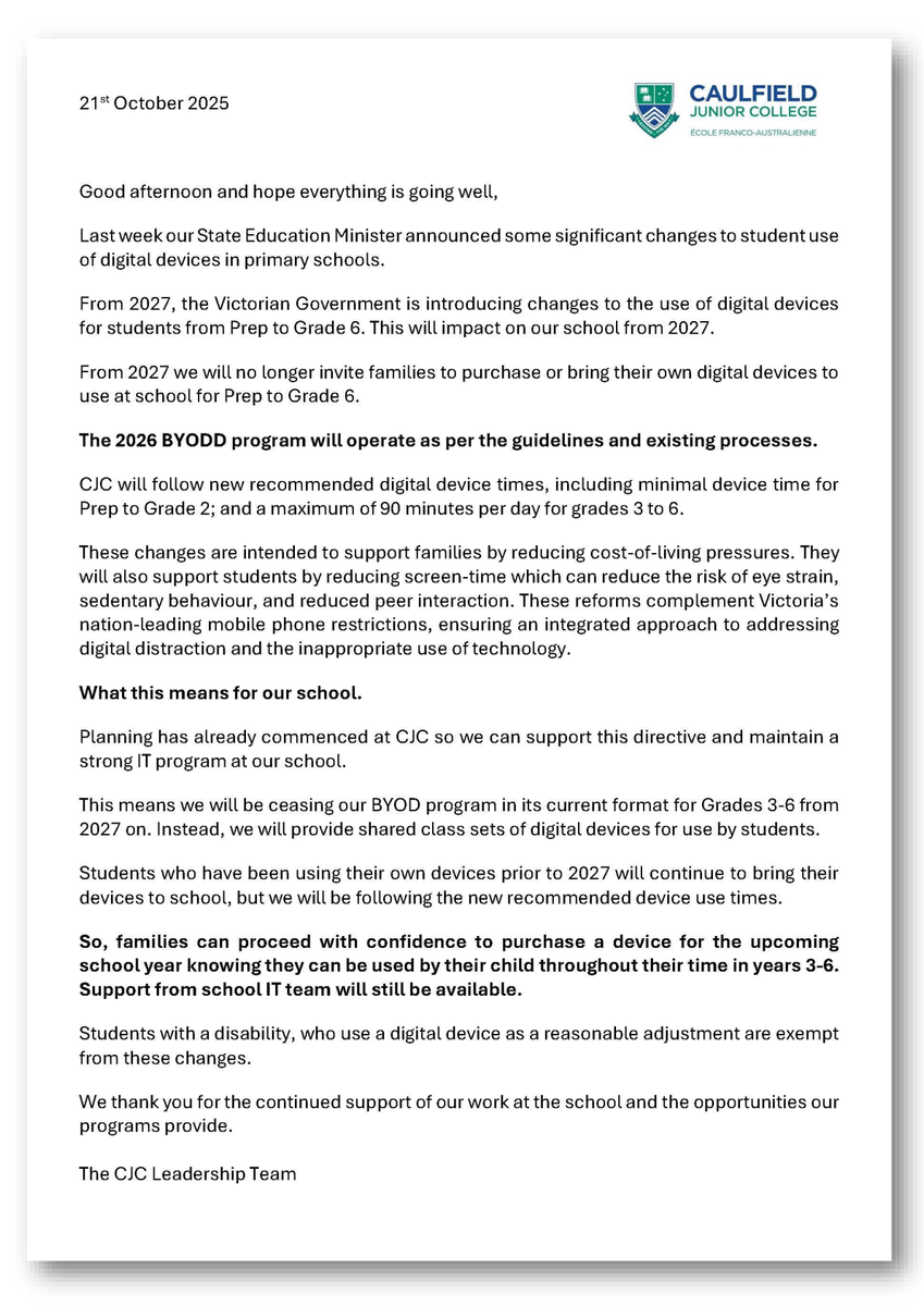 Last week we had an announcement from our Minister of Education regarding the BYODD program and the amount of screen time our children should be accessing. Please find a copy of our most recent communication to CJC families in that space.