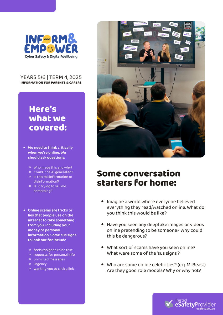 This week, students have taken part in targeted and integrated lessons focused on online safety and digital wellbeing, connecting these important themes to their current units of work. The week also coincides with our final Inform and Empower incursions for the year, running across this week and next, which further support students in developing safe and responsible online habits. Our current and newly appointed STEM Leaders also took the lead in interviewing students from across the school to explore their understanding of what it means to be a positive digital citizen. Thank you Cevan, Malo, Jake and Idelle for supporting this important cause.