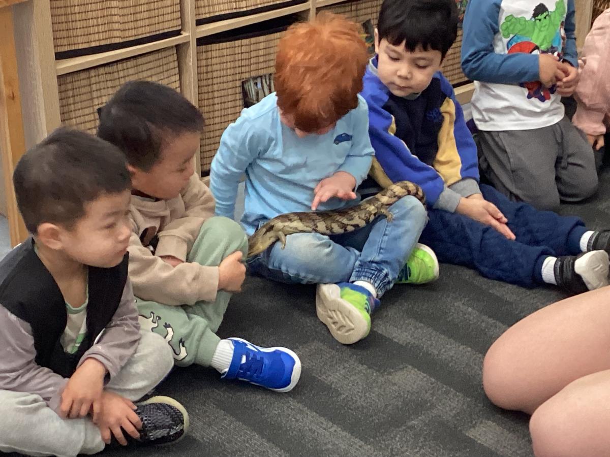One by one, the children were introduced to a variety of creatures—including lizards, a snake, a sugar glider, a green tree frog, and a long-neck turtle. With each introduction, Monique shared interesting facts before inviting the children to gently touch or hold the animals if they felt comfortable. The room was filled with excitement and wonder as the children eagerly engaged with each new animal friend.