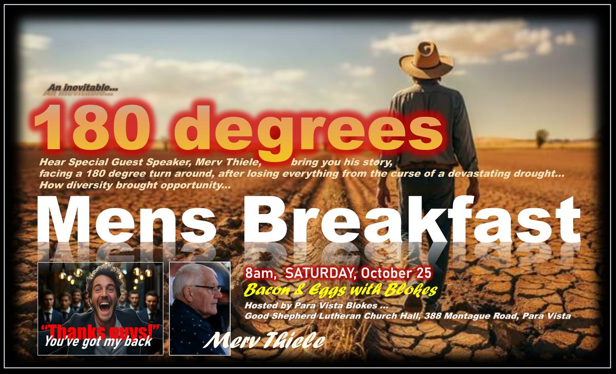 Good Shepherd Church is hosting a Men's breakfast this Saturday the 25th of October beginning at 8am in the church hall. Come along for fellowship with other blokes, and hear Guest speaker Merv Thiele, share his story of how his life turned around after a devastating circumstance. Enter through the church doors facing Montague Road. For more information, contact the church office on 8263 5087.
