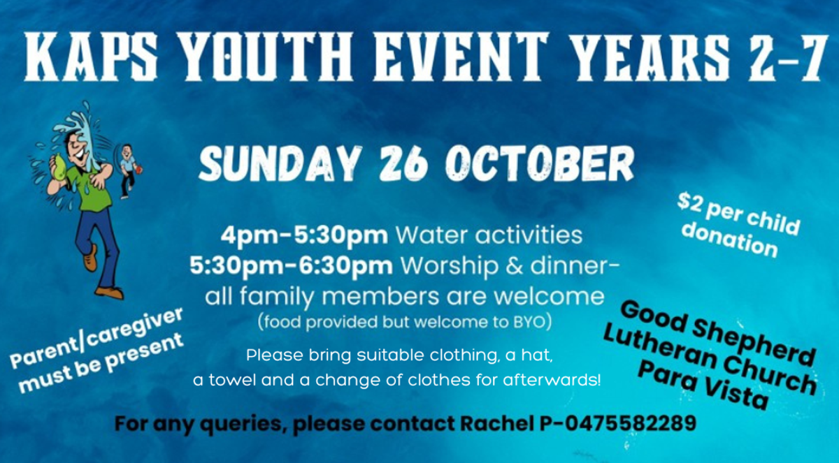 We are getting ready to make a splash! It would be great for young people to bring a hat, bathers/ rash vest/ shorts and a towel for our water themed activities... as well as a change of clothes for our worship and meal that follows. Please note: If it happens to be too wet (i.e. raining) we will have some alternate indoor activities ready to go. Think about who you might like to invite... See you Sunday!