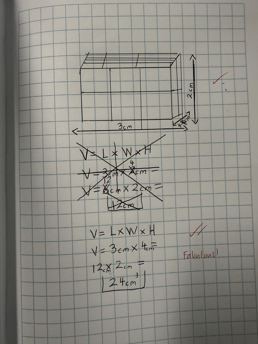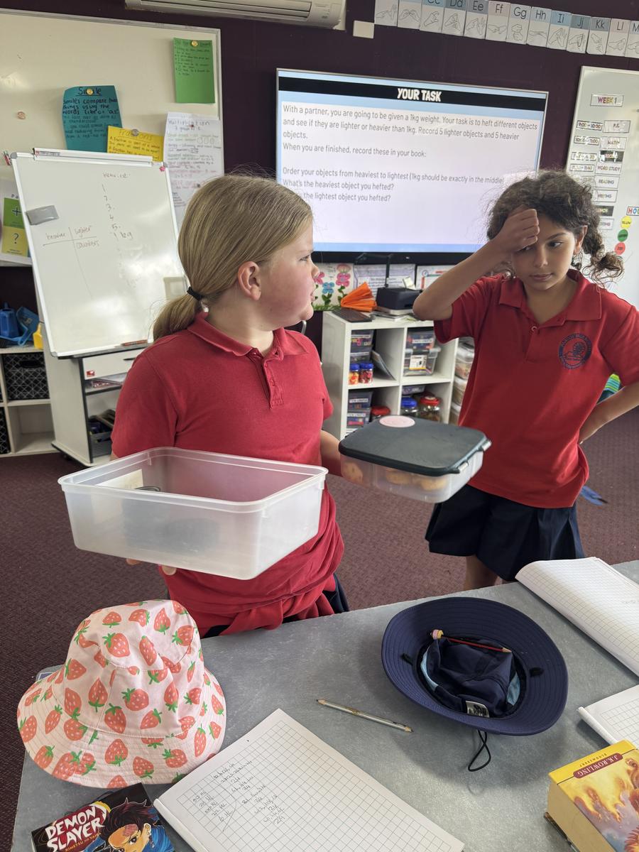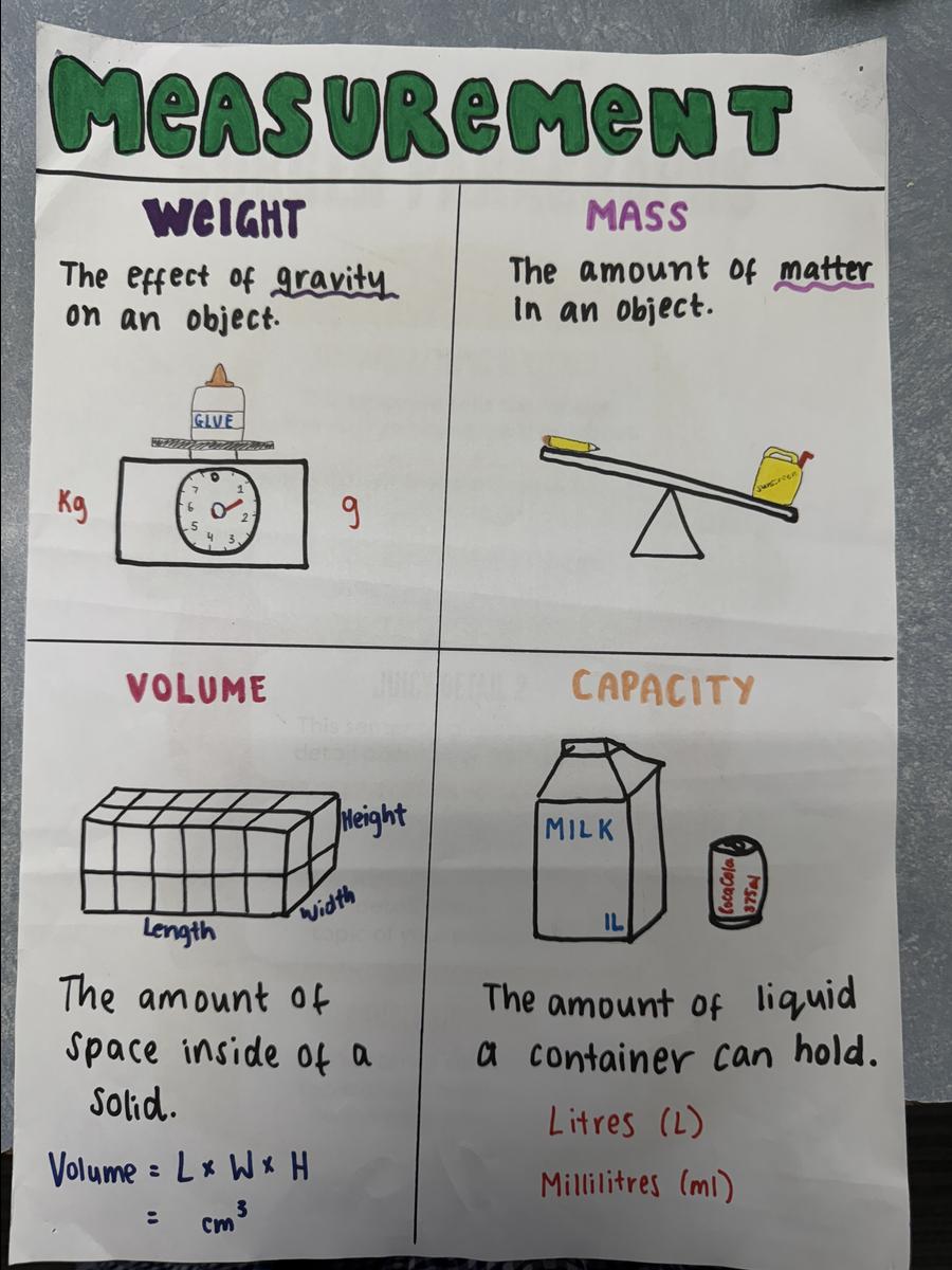 In Maths, students have been learning all about volume and mass. They've explored using a formula/rule to calculate the volume of rectangular prisms (V=LxWxH). They have also practiced the skill of hefting, as well as using scales to weigh items around the classroom. The past 2 weeks in Maths have allowed students to show their working out through practicing their calculations and use concrete materials to support their learning.