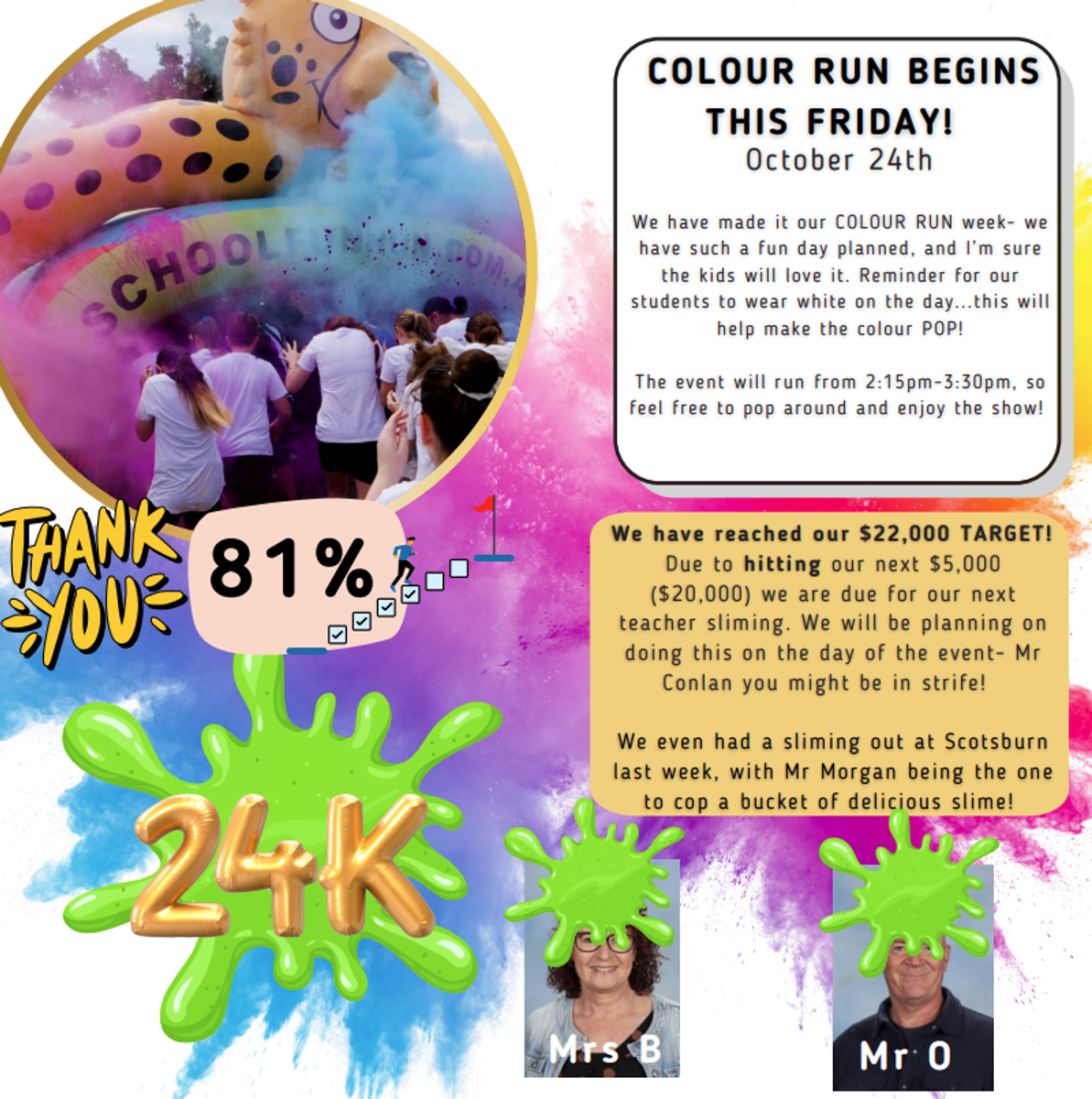 Scotsburn Working Bee - Thursday 23 October, Family Groups - Sustainability and Gardening, Buninyong Community Playgroup Art Incursion , Colour Run - this Friday 24th October, Mr Morgan Gets Slimed!, Scotsburn Sleepover - Thursday 30 October - Friday 31 October, 2026 Scotsburn Enrolments