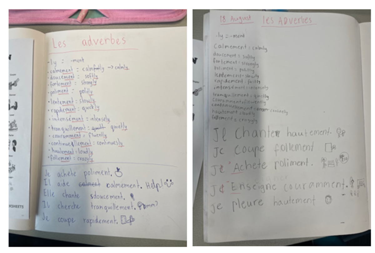 Grade 3 explored how to form French adverbs using the -ment suffix. They enjoyed making their own sentences with adverbs and verbs, showing lots of creativity. We also revisited greetings and wishes, and students remembered them very well!