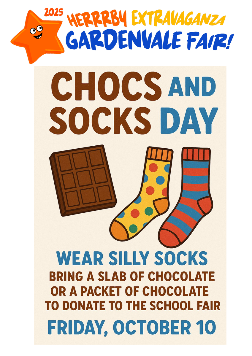 Students are able to wear fun socks and bring along a chocolate to donate to the fair. It can be a slab of chocolate or a packet of smaller ones. Students wear normal school uniforms, just fun cute socks and bring chocs to donate!