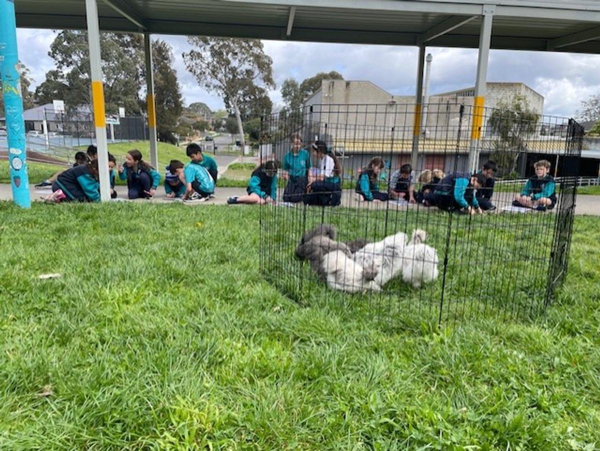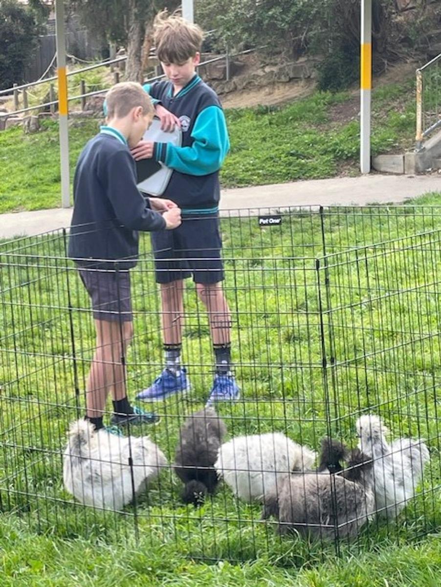 The chickens went on an incursion this week to grassy fields while our Year 3s did their maths. Our Year 5 friends helped set up the pen and the chickens looked very happy with some lush green grass to peck at.