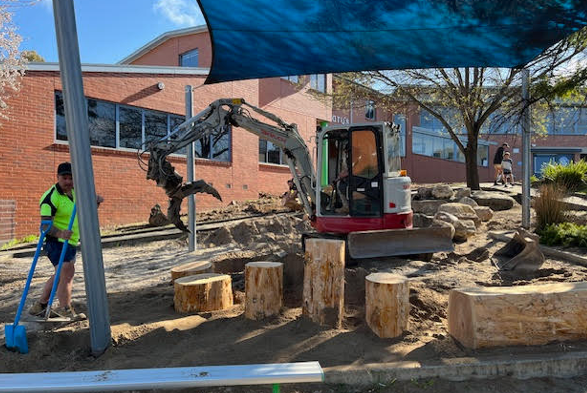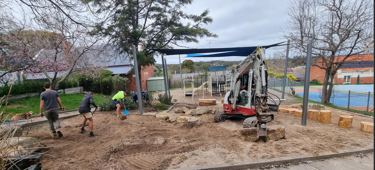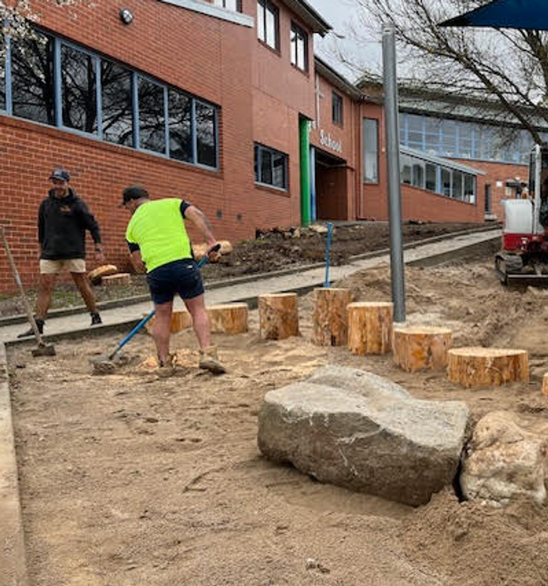 So far, the sandpit has been transformed into three tiers, created using natural elements such as rocks and wood. This is the beginning of a truly special space for our students to enjoy and explore.