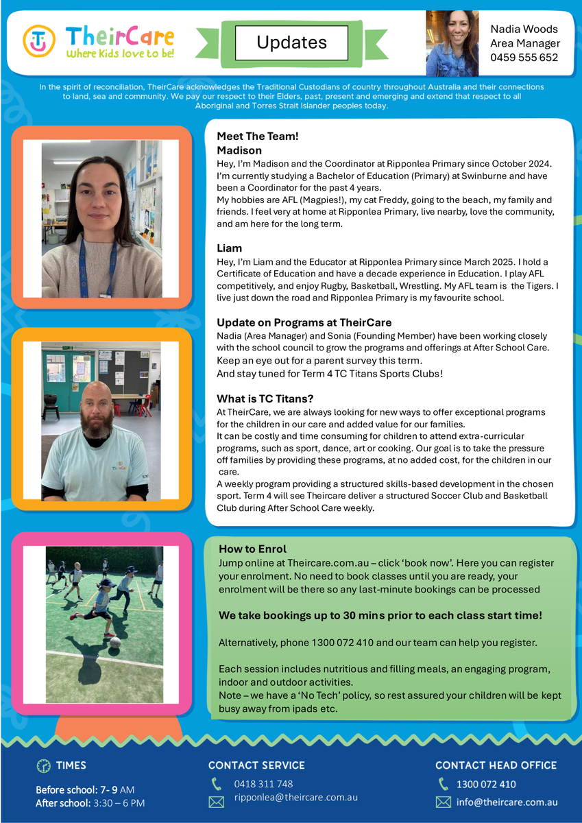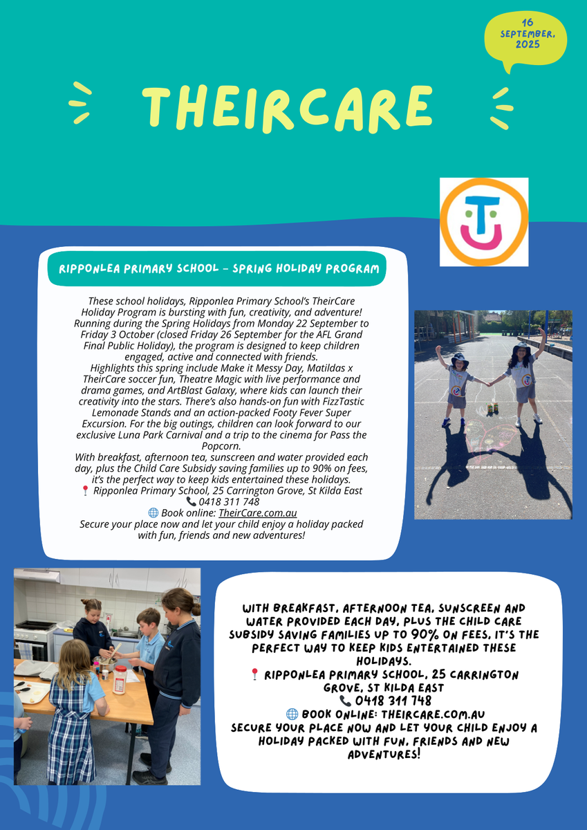 As a community, we know many of our families are navigating busy schedules, balancing school pick-ups, drop-offs, and a range of after-school activities. Ripponlea Primary School has been very fortunate to have TheirCare as our Outside School Hours Care (OSHC) provider, offering both before-school and after-school care options for our students.