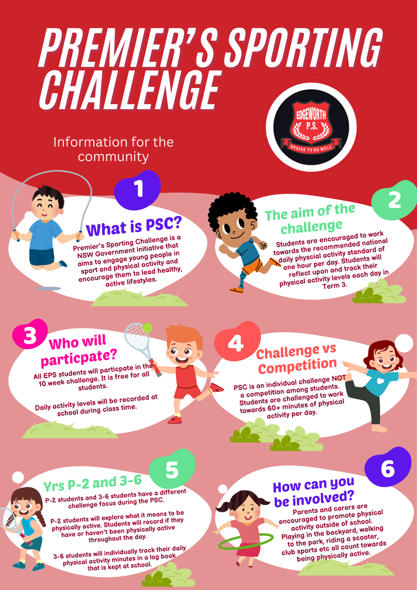 This term, all P-6 students will participate in the Premier’s Sporting Challenge. The purpose of the challenge is to encourage students to participate in sport and physical activity and to understand the benefits of physical activity on our health and wellbeing.