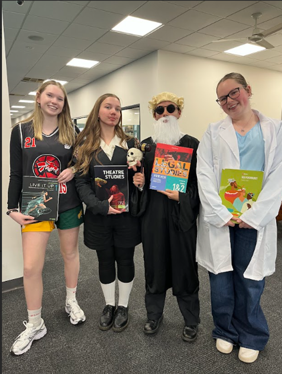 Yr 11: Emma McCleary, Cathy Spicer, Maddison Smith, & Addisyn Todd, who dressed as their textbooks (or, as careers derived from their textbooks)