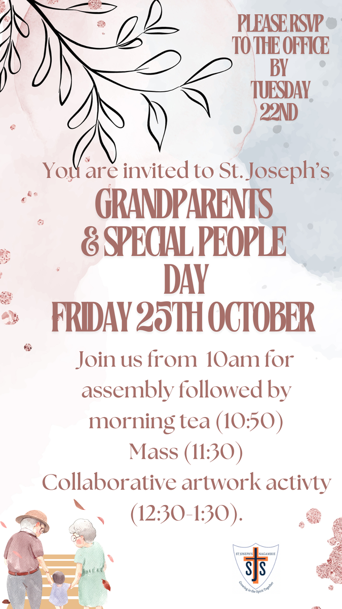 Next Friday 25th October we are recognising the wonderful Grandparents and Special people we have in our lives by inviting them to a special day starting with assembly at 10am, followed by morning tea, mass (11.30) and a collaborative art activity from 12.30 to 1.30pm. Could each family please provide a plate of food to share as part of the morning tea.