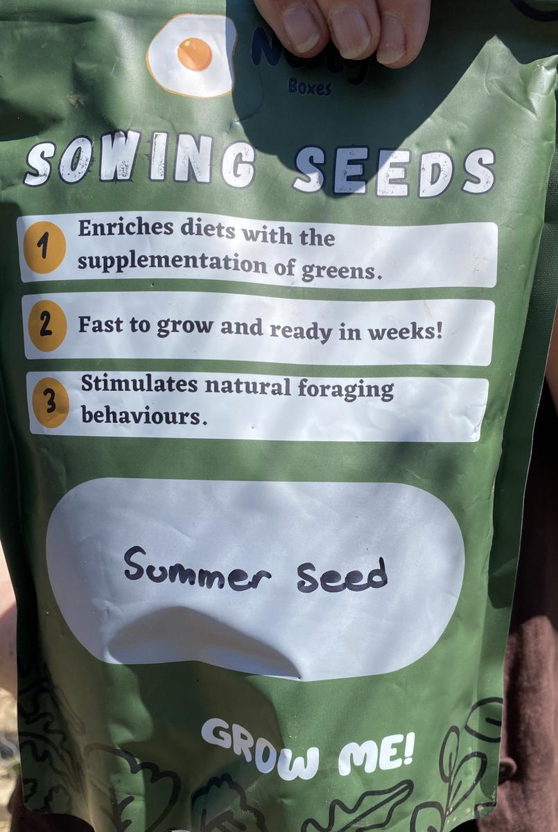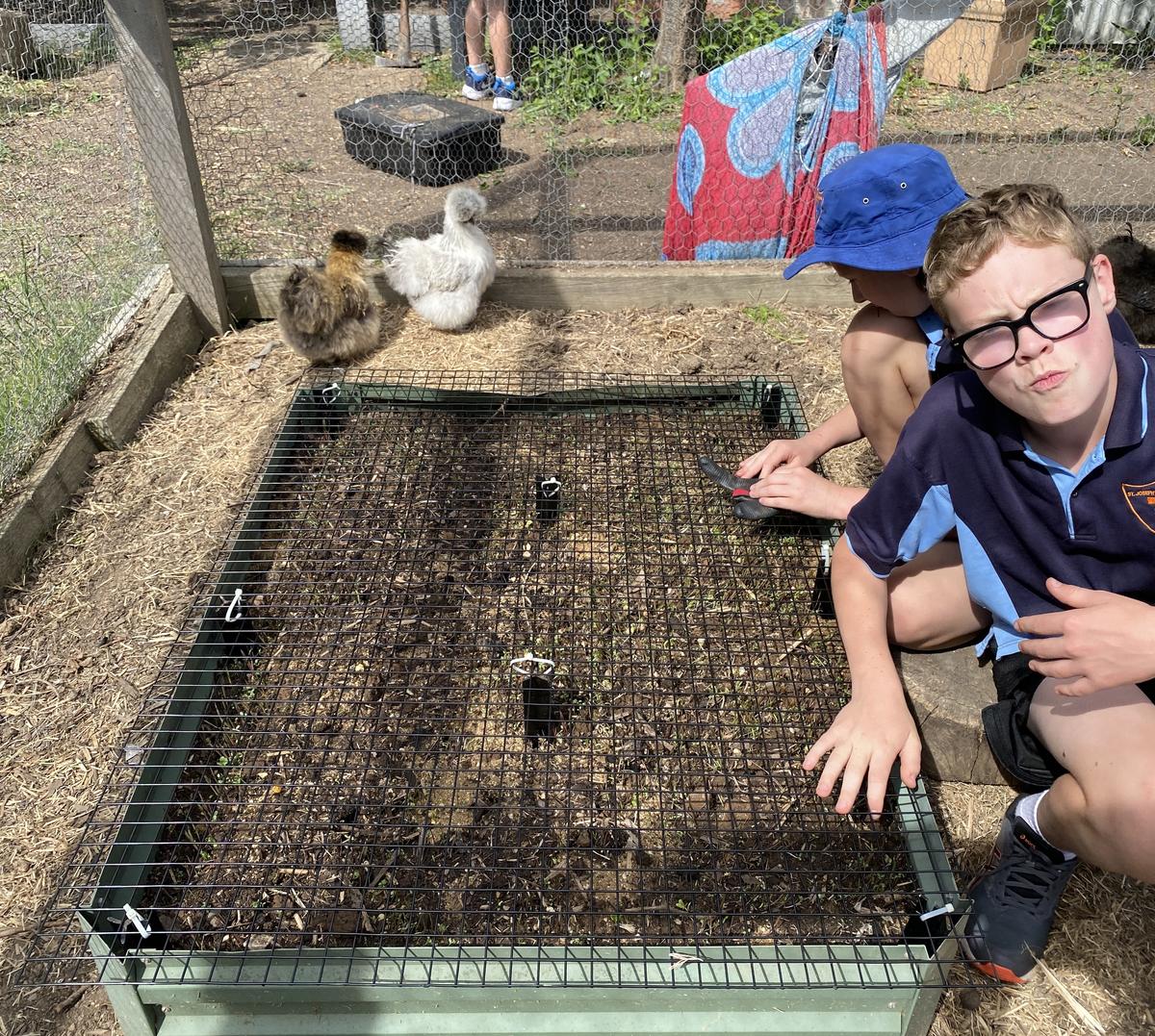 THANKS STEVE for making such an amazing and inclusive nesting area for our three new Silky bantams. The boxes are lower now for their little legs and so are the perches. We also have a foraging bed, planted with fodder for chickens, inside a raised bed covered in wire so they can't dig up the roots. The seeds germinated this week and were well watered by our caring students.