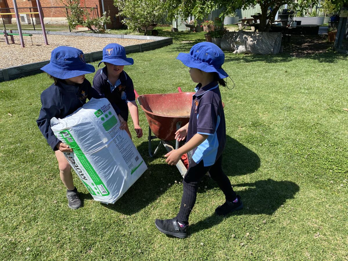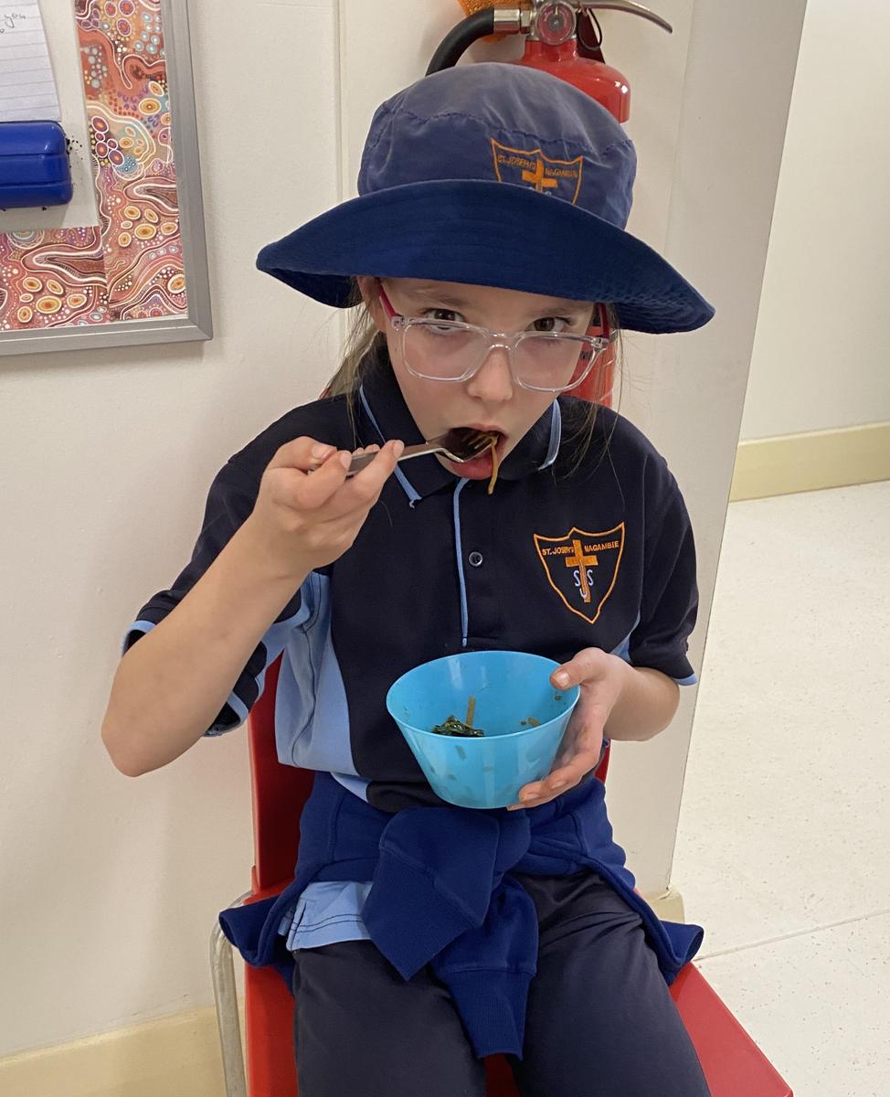 Students enjoyed the last of the asparagus, snow peas and broccoli today. During Science the students had fun making and tasting stir fry with Jacqui, using produce from our garden. With some great team work we got our sugar can mulch into the chook pen to provide cover from the sun to promote soil life. It will also encourage the chooks to scratch for insects and dig up weeds.