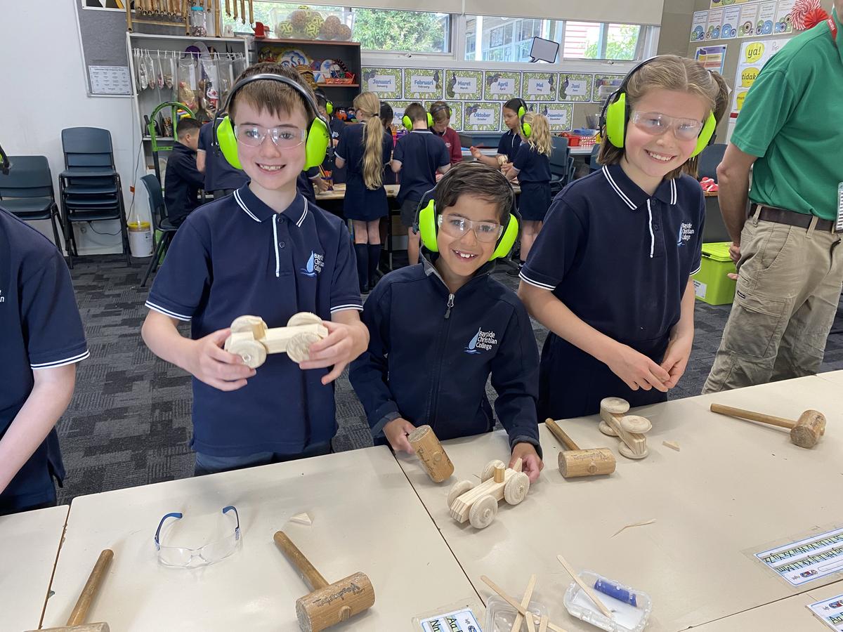 Jim demonstrated each of the tools and equipment that we would need to build our cars. First, we constructed the wheels and axles. Next, we pushed the wheels and axles through the body of the car. Finally, we put a wooden driver inside. We sanded down our car and personalised our creations. I loved it very much! - Liora, 3/4T