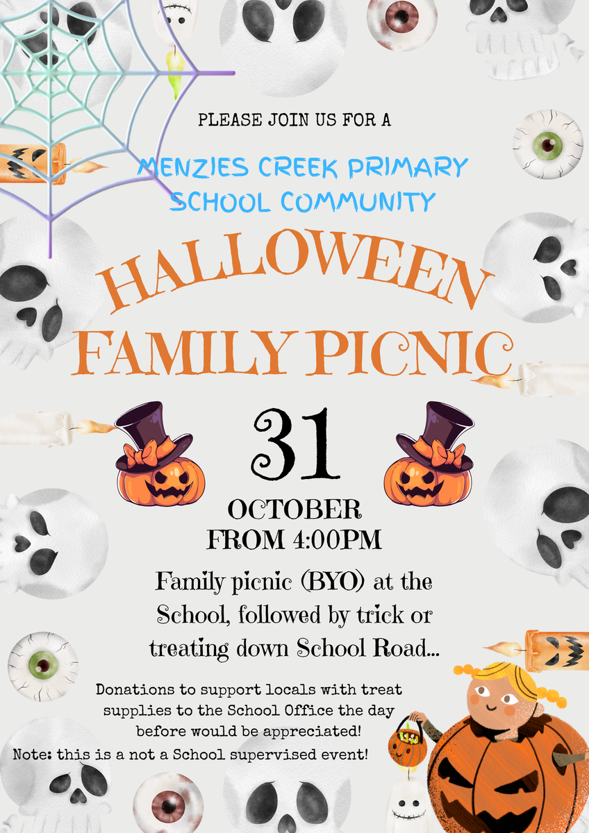 If your children will be continuing their Halloween fun in Menzies Creek along School Road, we’d really appreciate any treat donations to help support this wonderful community event. Donations can be dropped off at the school office, where they’ll be collected and shared out for the evening. This is a community-run event and not school-funded, so your support makes a big difference.