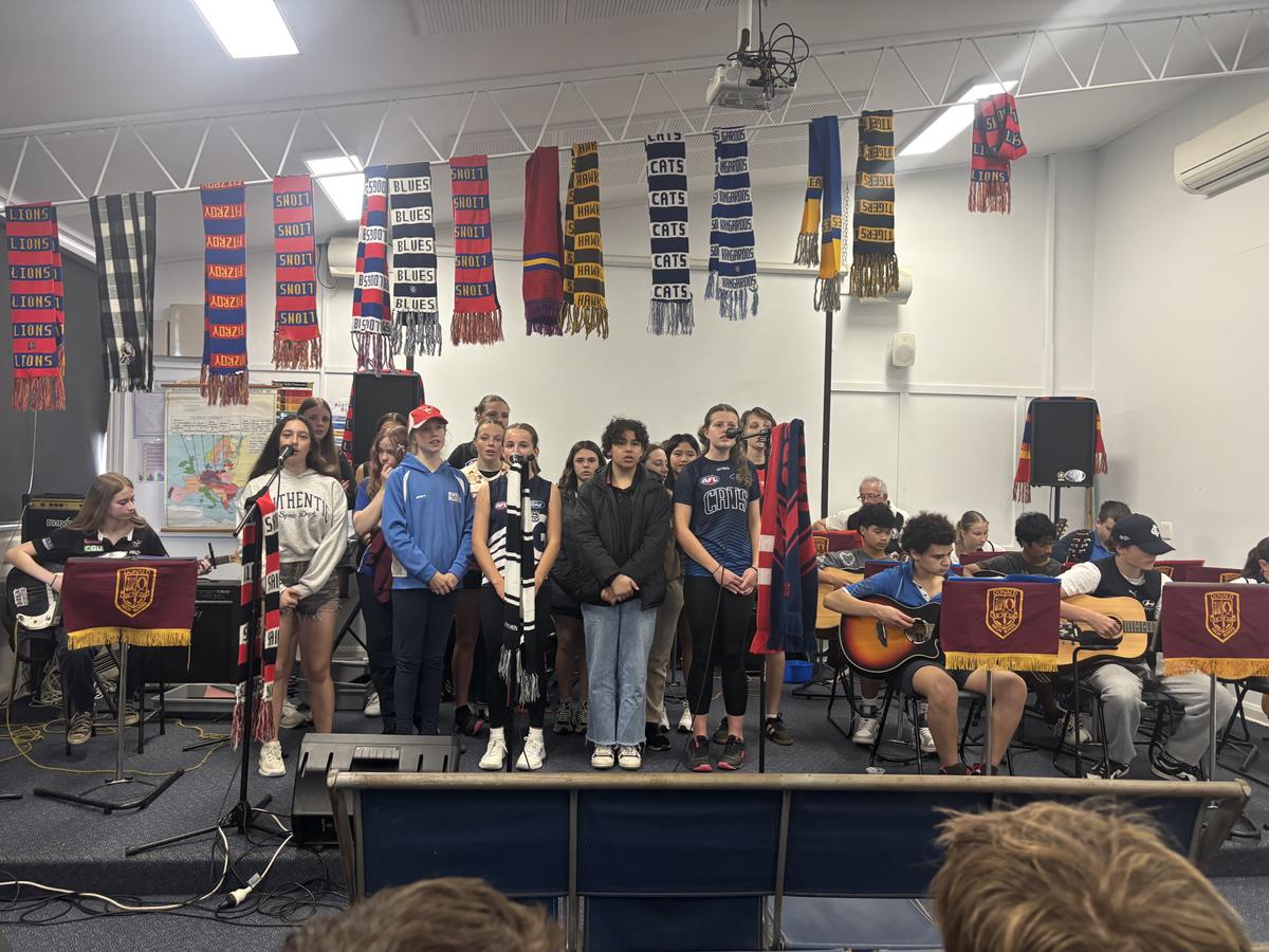 Then it was teacher Stuart Potter turn to “strutt his stuff” by singing Another One Bites the Dust and then producing a lively performance of Living on a Prayer, backed up by the Year 12 students.
