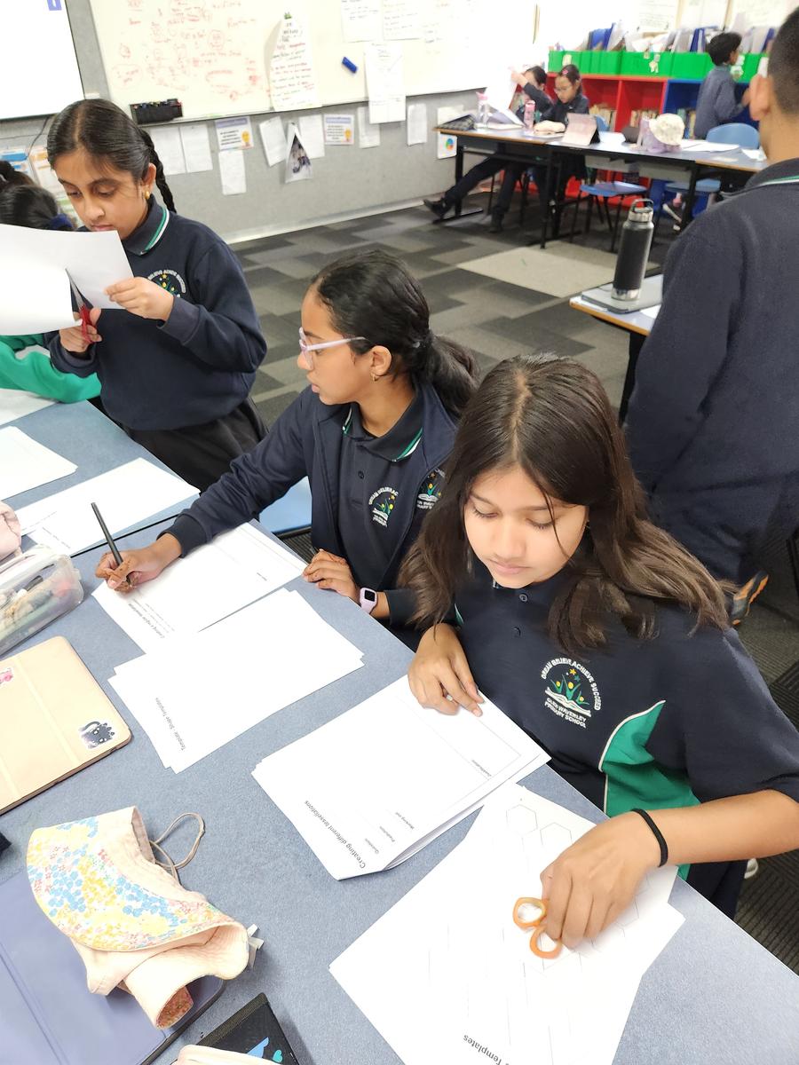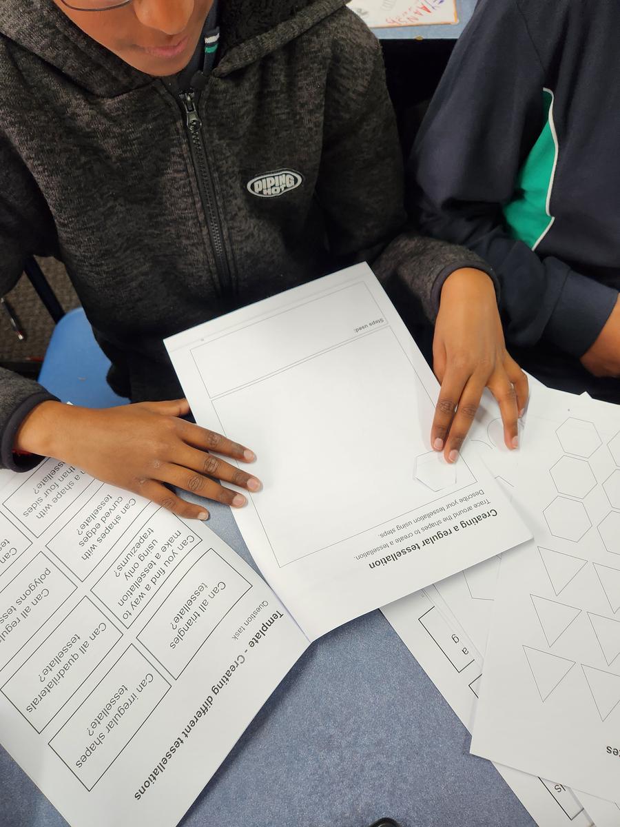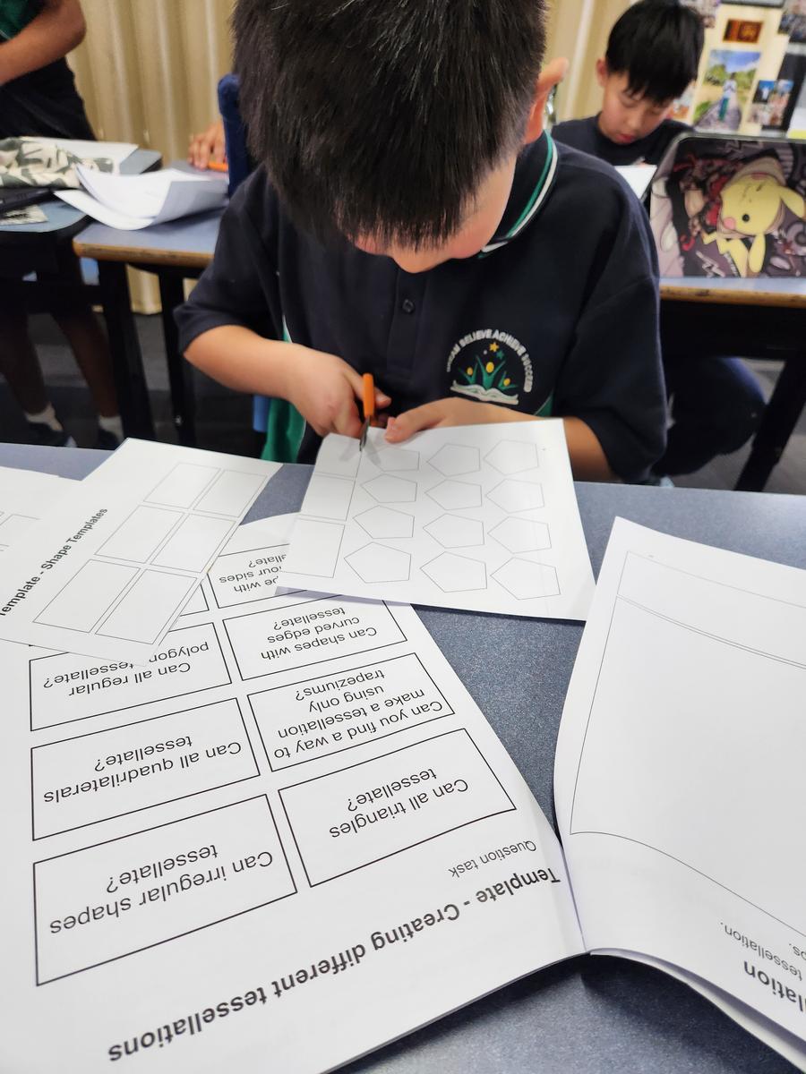 In Mathematics, students have been working with shapes to form tessellations, exploring how geometric patterns can fit together without gaps or overlaps. They investigated different types of tessellations, created their own repeating designs and discussed where these patterns appear in everyday life such as the brickworks.