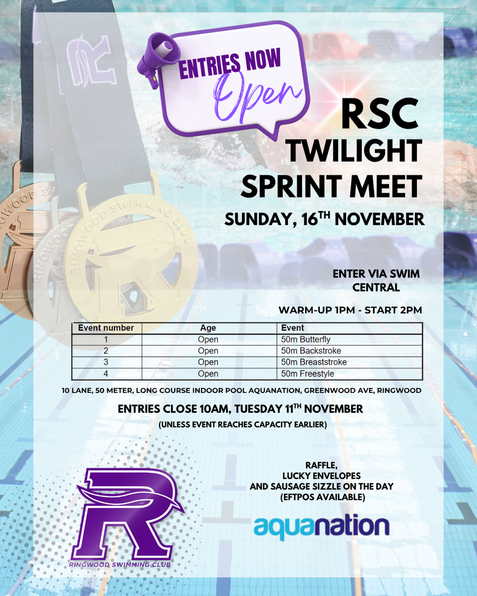 In November we host our Annual Twilight Sprint Meet. As there are only 50m events for each stroke, it is a short, fast meet. Entries are open on Swim Central, Be sure to enter as this meet will likely fill up fast.