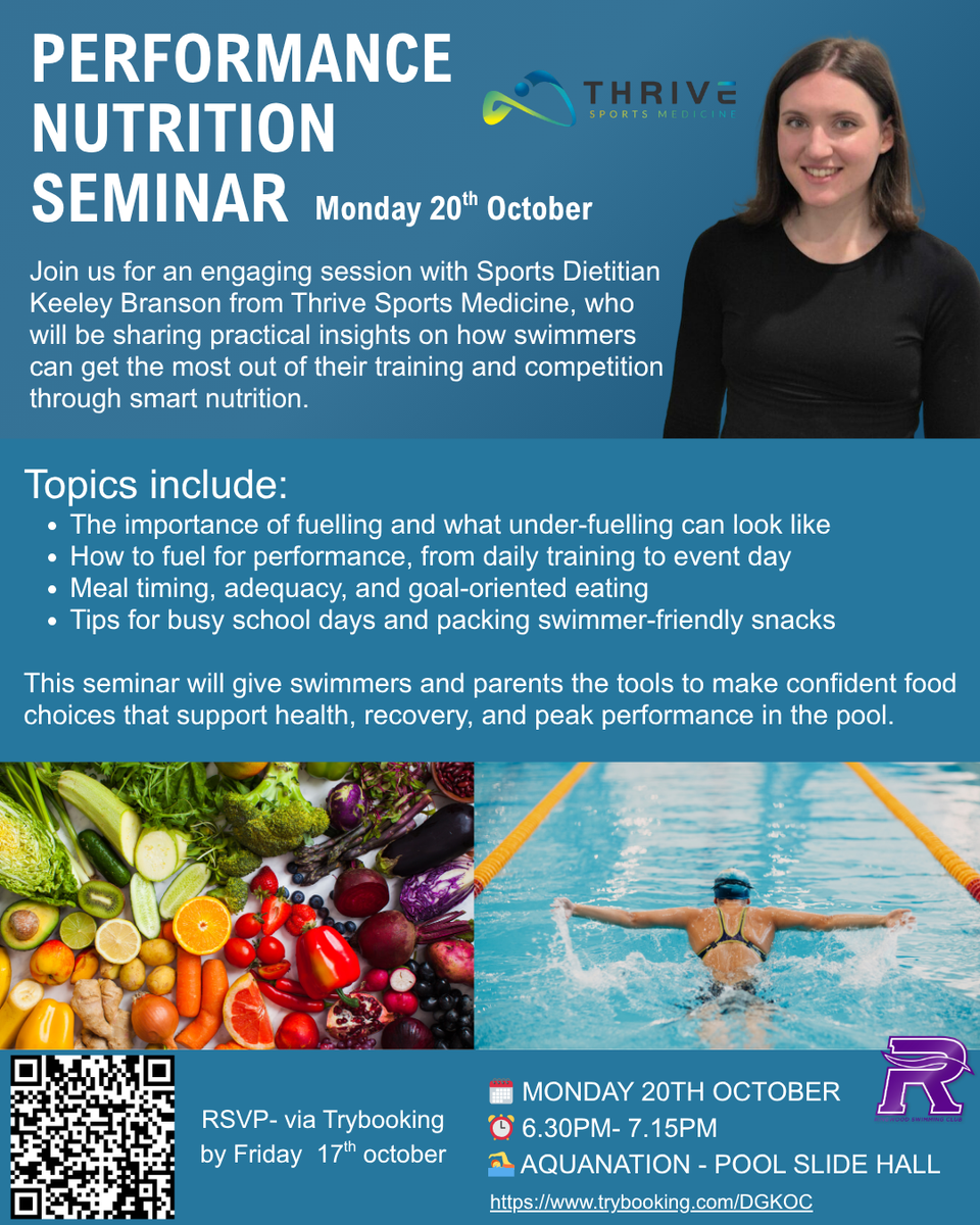We’re excited to invite all swimmers and parents to our Performance Nutrition Seminar, presented by Sports Dietitian Keeley Branson from one of our club partners- Thrive Sports Medicine.