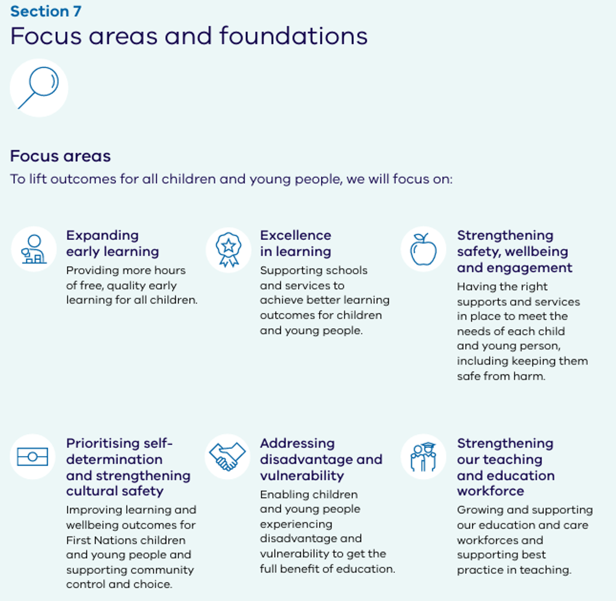 The plan outlines the priorities that will guide system-wide efforts to deliver excellent outcomes for Victorian children and young people. The following areas will shape the Department’s work over the four years and are critical for school leaders to note: