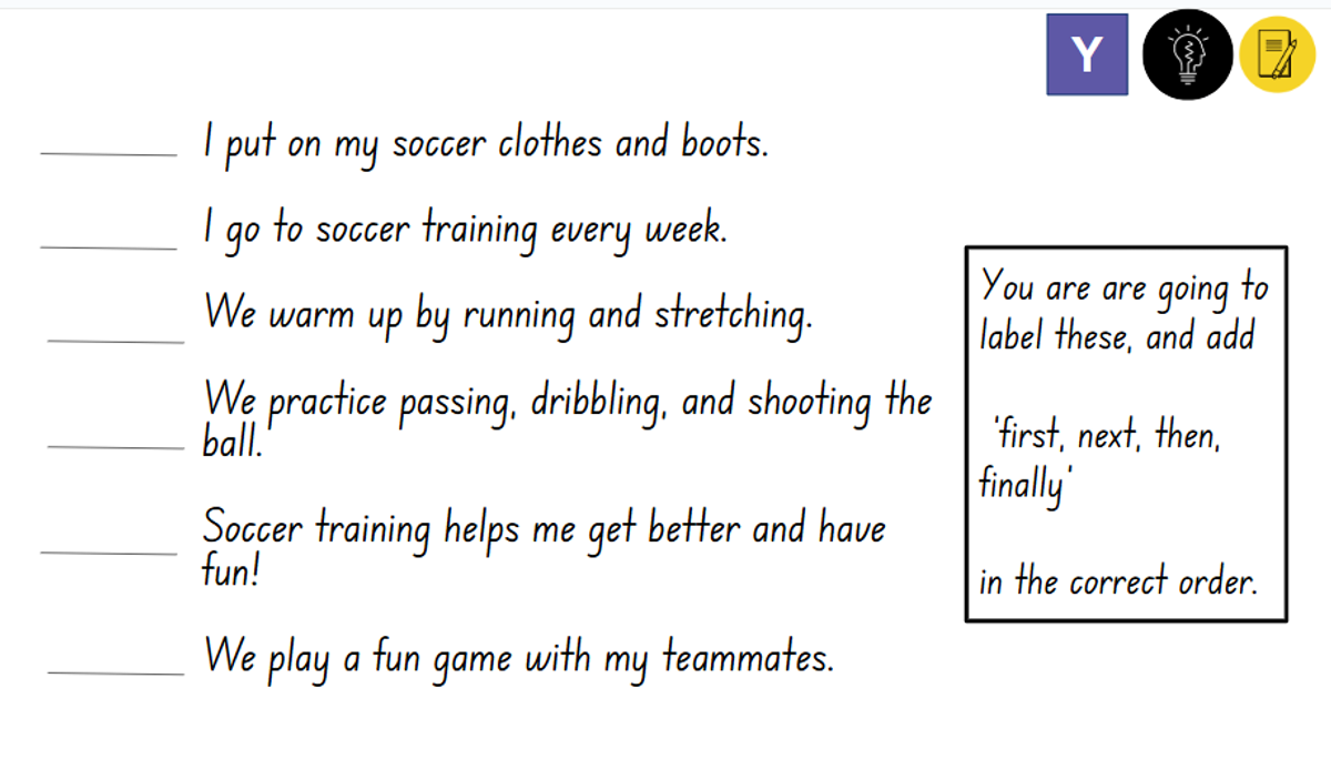 In Text-Level Writing, students have continued to work on ordering supporting details. They have been able to identify the topic sentence, add details in order using first, next, then, and finally, and finish with a concluding statement.