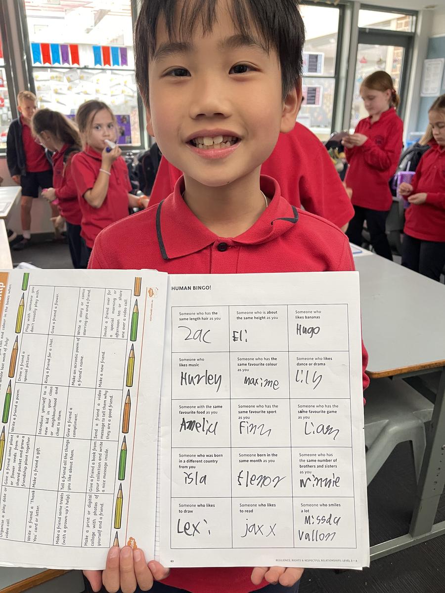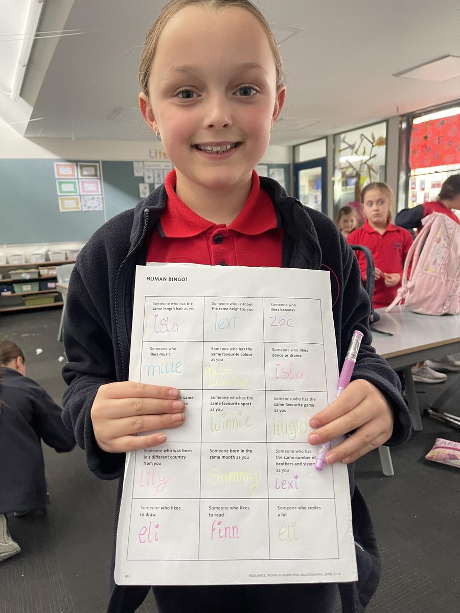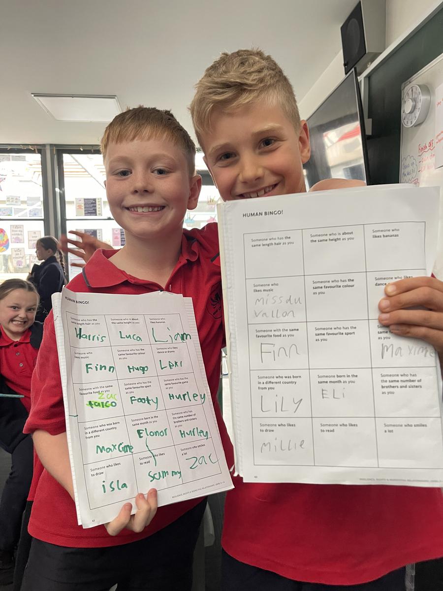 This fortnight, students began exploring the concept of identity. They played a āhuman bingoā game to highlight similarities and differences, discussing how these make us unique and interesting individuals. Students then completed an identity wheel, highlighting important parts of their identity and sharing with the class.