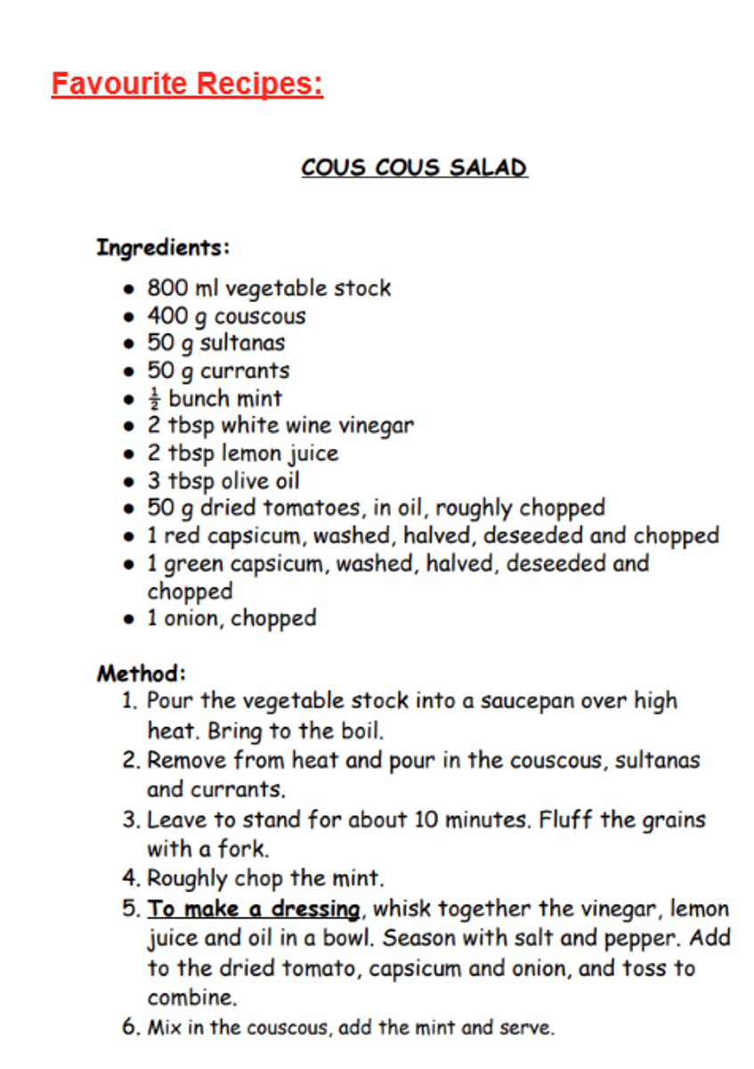 Louis - I made couscous and it smelt amazing. We added sultanas, red and green capsicum, and onion. The dressing smelt a bit weird so I can’t wait until I try it.
