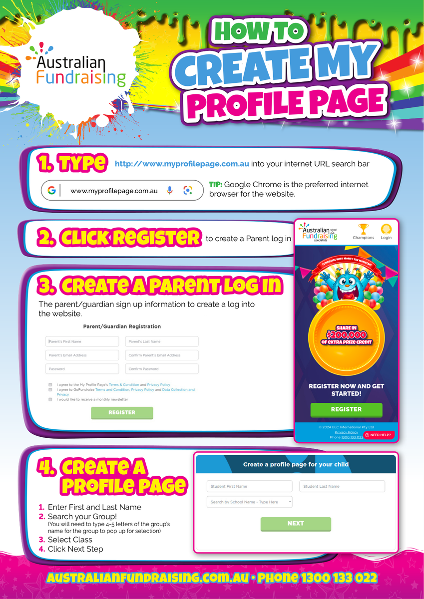 To set up an online fundraising profile, go to www.myprofilepage.com.au and click the 'Register Now' button to create the profile page.