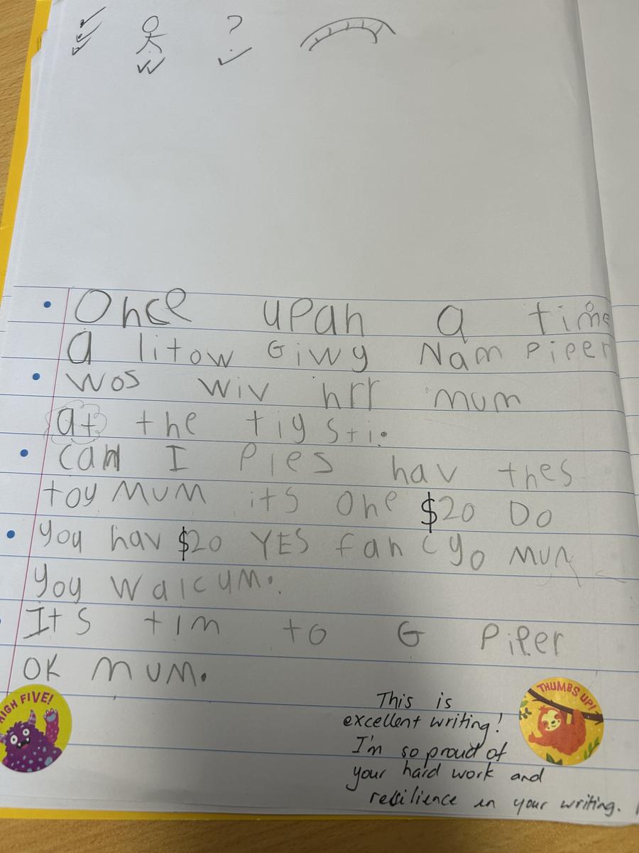 At the start of the year, Piper was copying sentences; now, she confidently writes whole stories independently! Her latest piece shows clear effort and pride — she’s working hard to sound out words correctly, use punctuation, and create stories that make sense and flow beautifully.